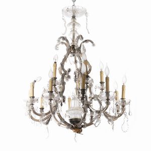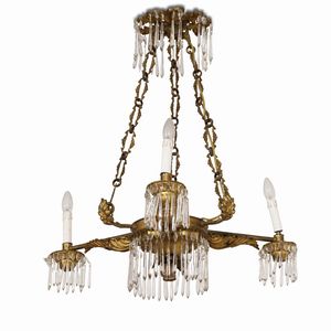 Lampadario a tre luci in metallo dorato con cristalli. XX secolo
