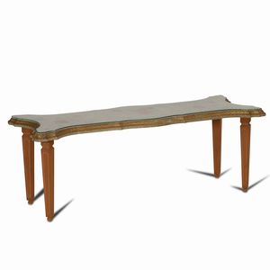 Tavolo in legno intagliato, dipinto e piano in vetro, XX secolo
