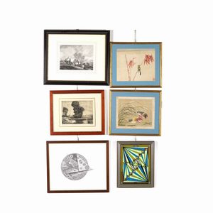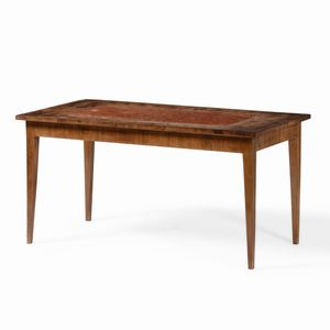 Tavolo con piano intarsiato e marmo rosso di Verona incassato, ricomposto con elementi [..]