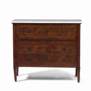 Comoncino a due cassetti lastronato ed intarsiato. Fine XVIII secolo
