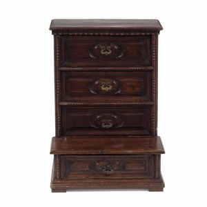 Coṃ a tre cassetti in legno lastronato in noce ed intarsiato, XIX secolo