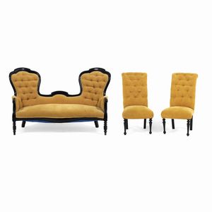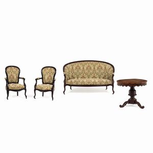 Salottino composto da divano, due poltrone, tavolino con piano intarsiato, XIX s [..]