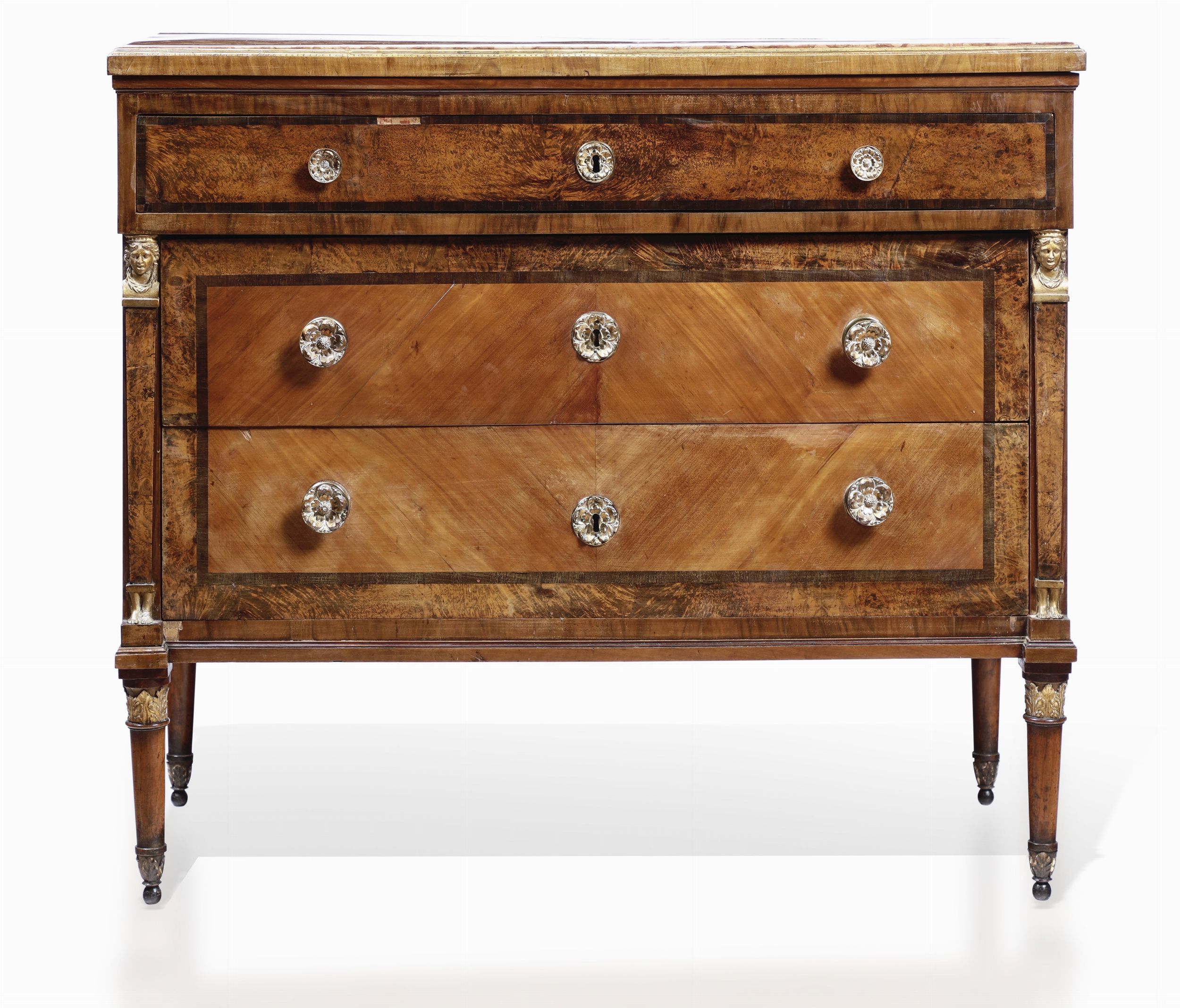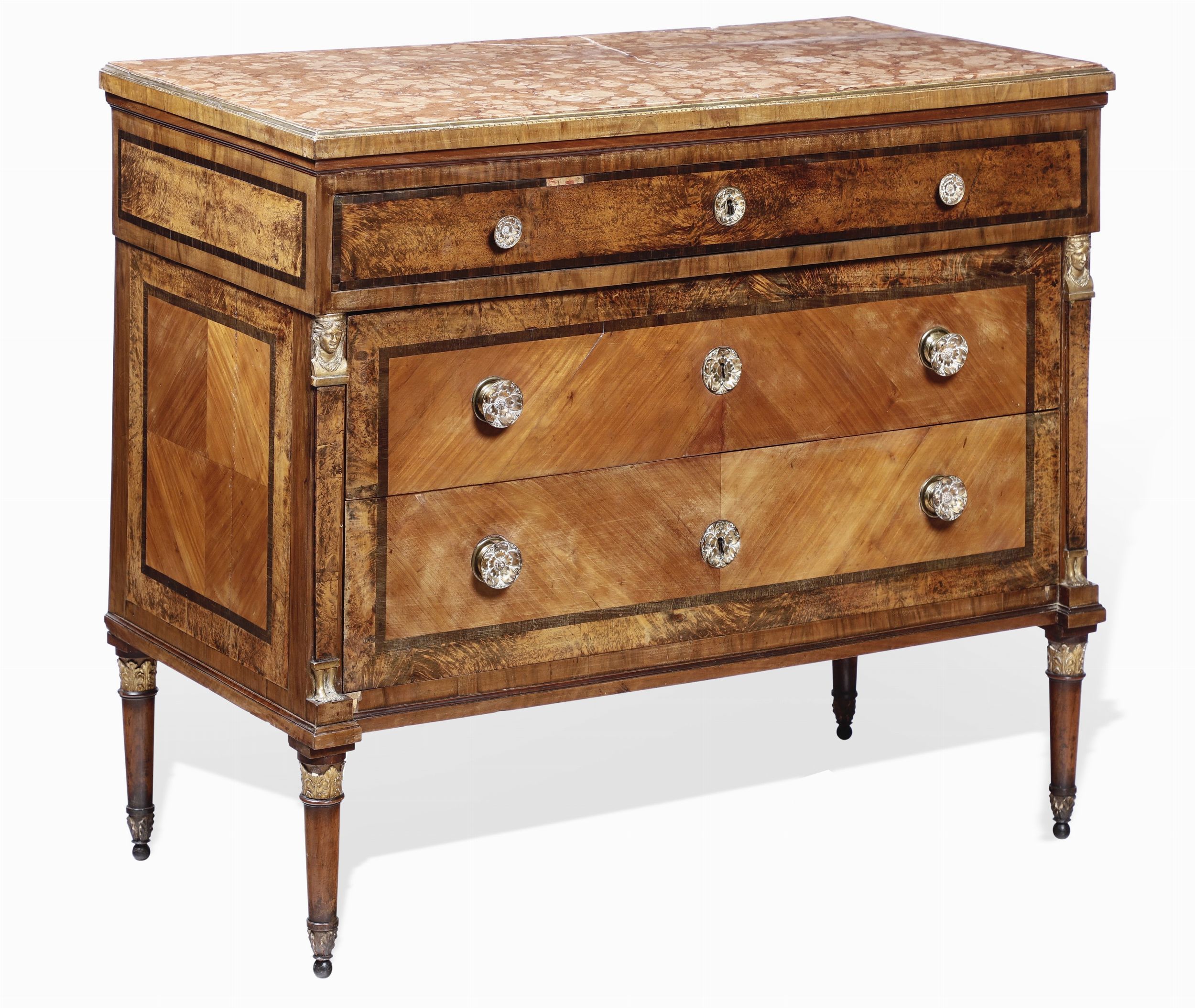 tre cassetti sul fronte, lesene sui montanti, piano in marmo, cm 120x60x101 (difetti, rotture)