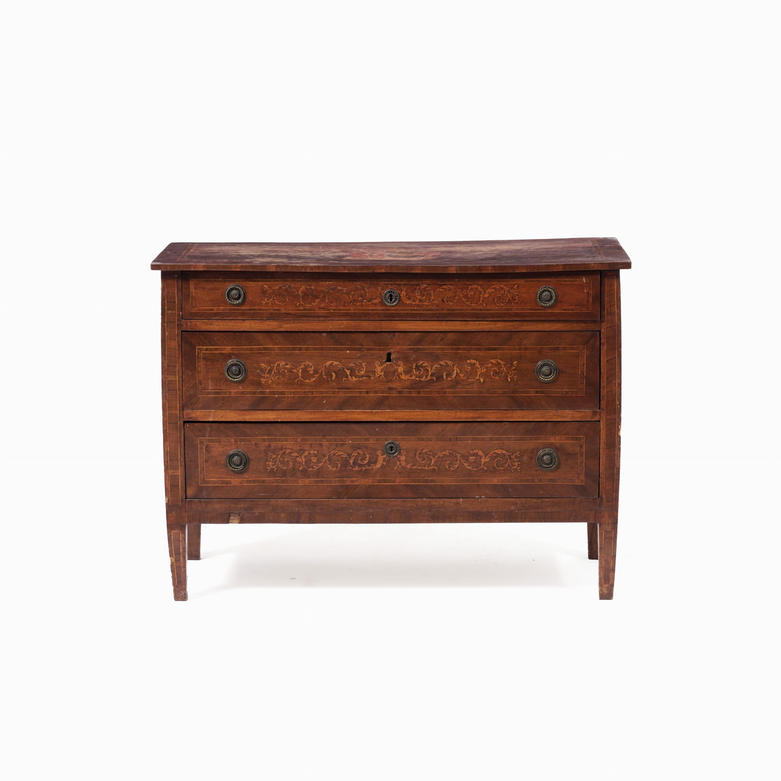 Coṃ a tre cassetti in legno lastronato in noce ed intarsiato, XIX secolo