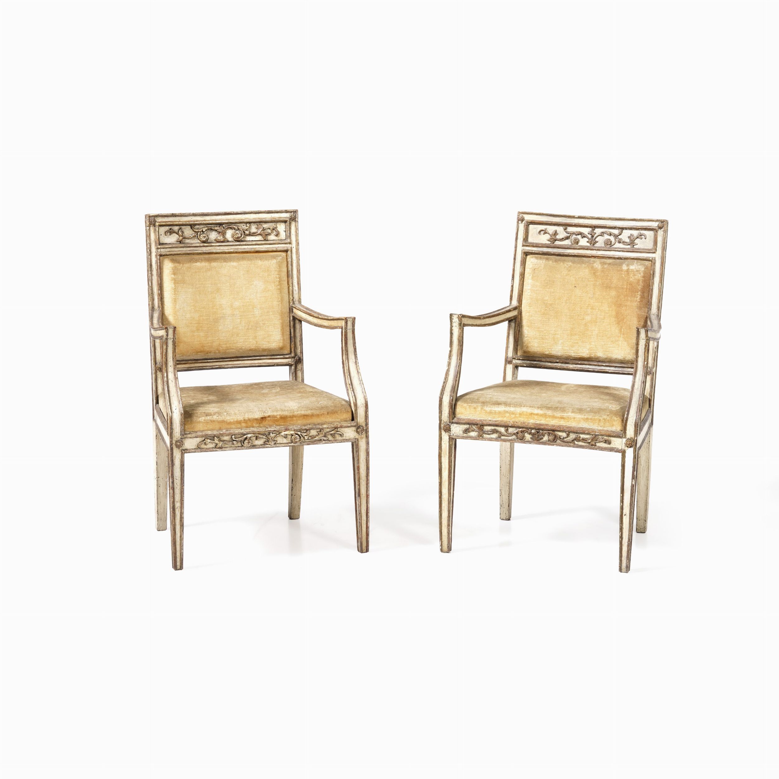 Coppia di poltrone in legno laccato e dorato, XIX-XX secolo