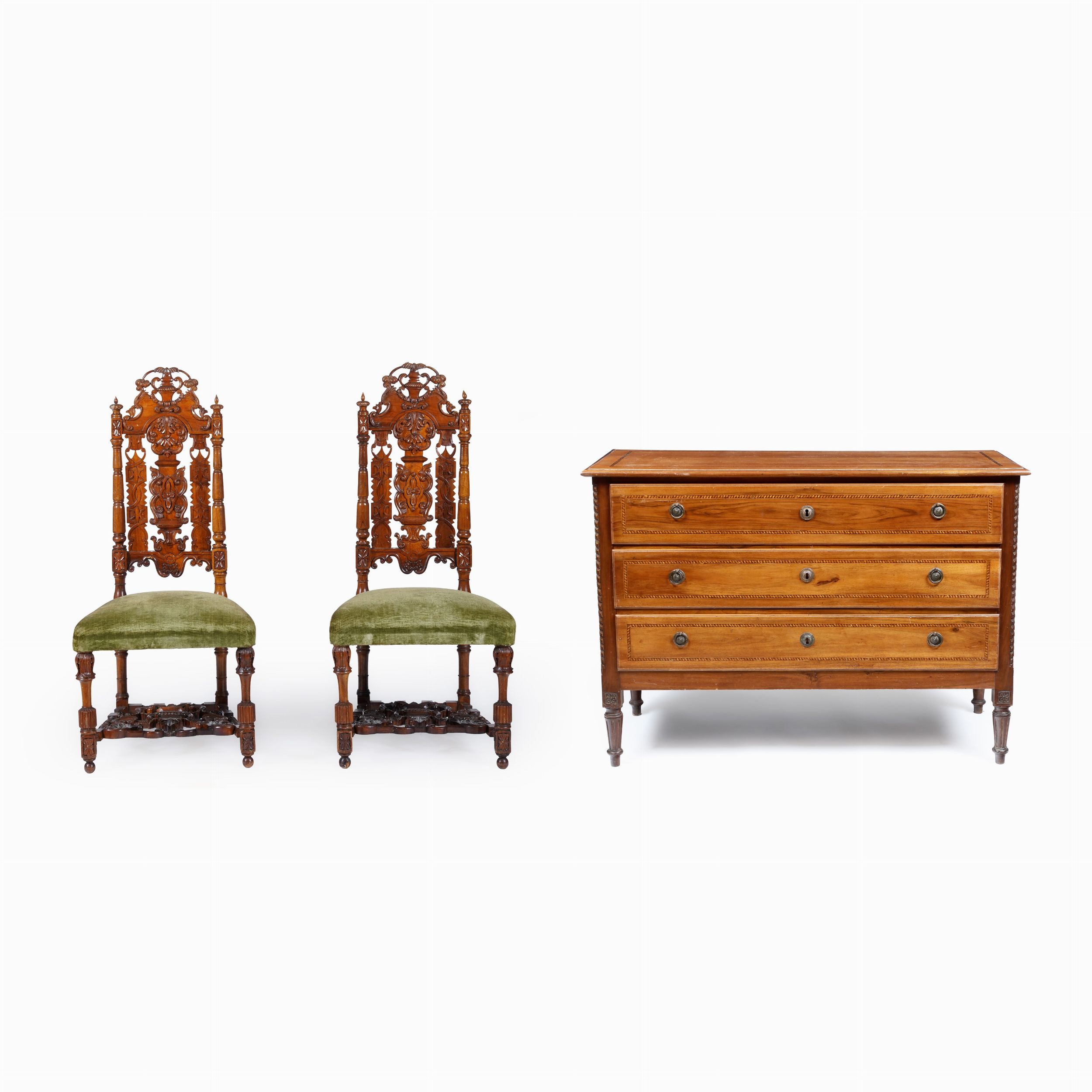 Coppia di sedie con schienali riccamente intagliati e cassettone in noce