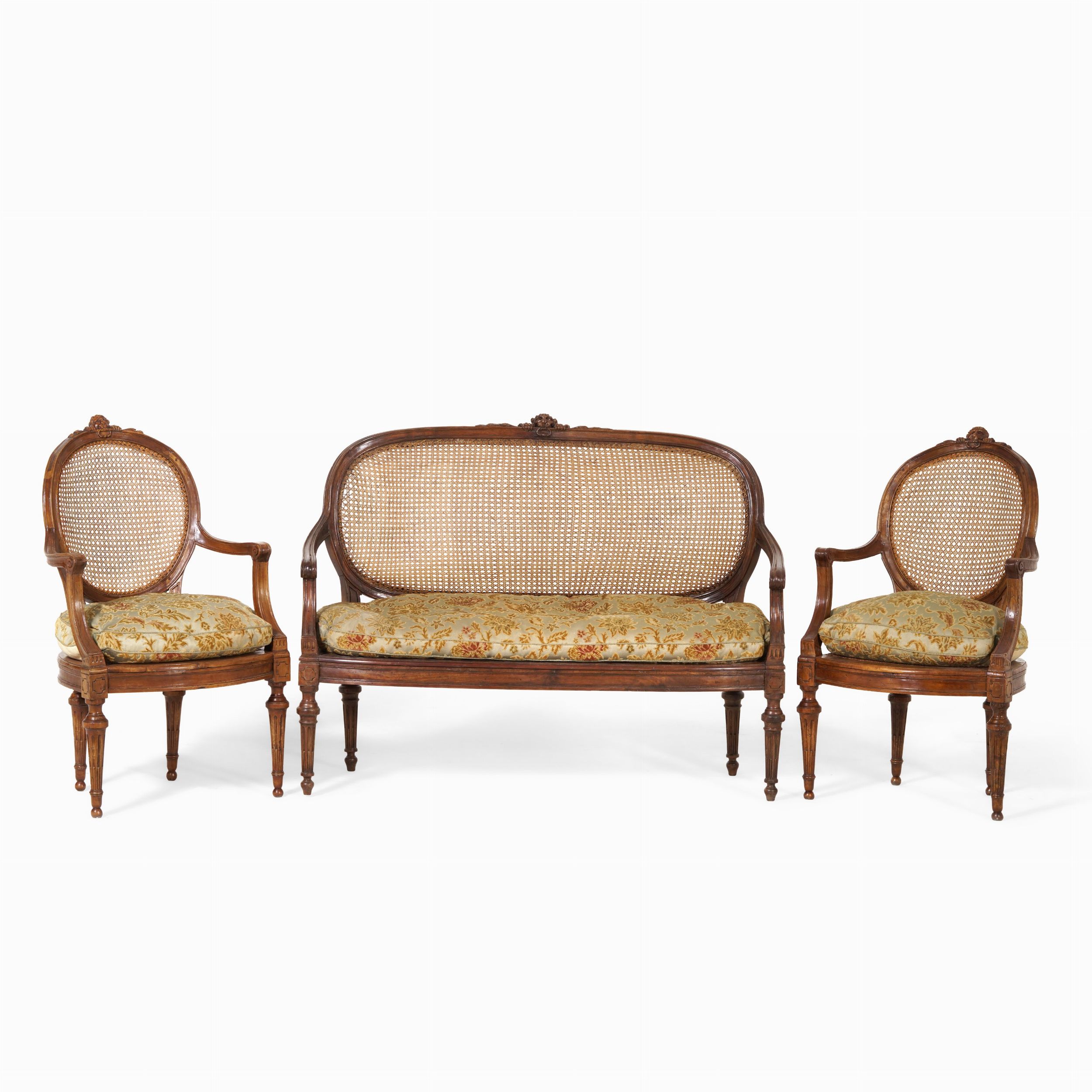 Divano e coppia di poltrone in legno intagliato. Genova, fine XVIII secolo