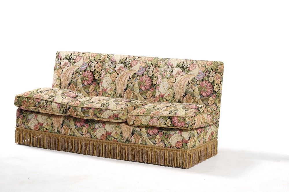 Divano e due poltrone in tessuto con scene di fiori e animali