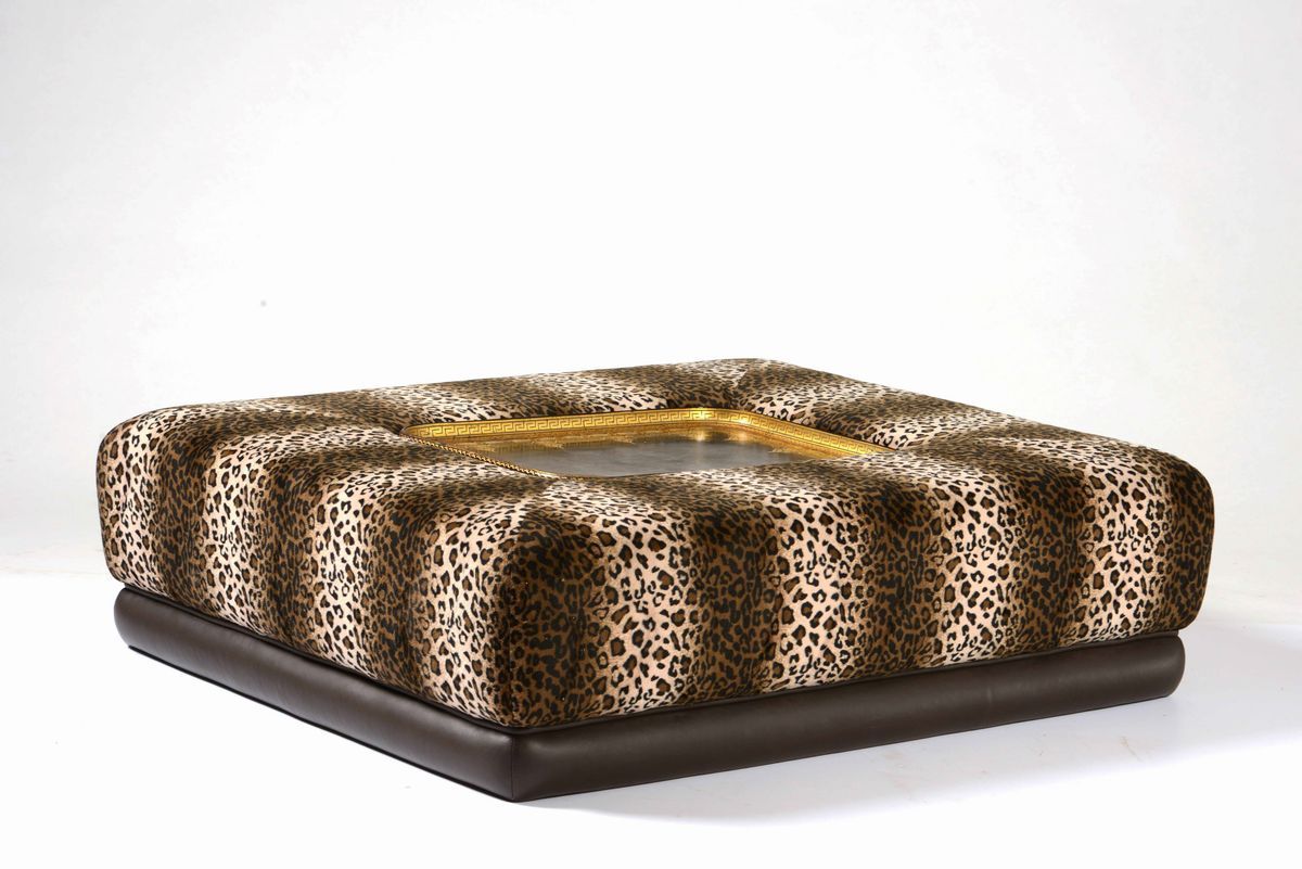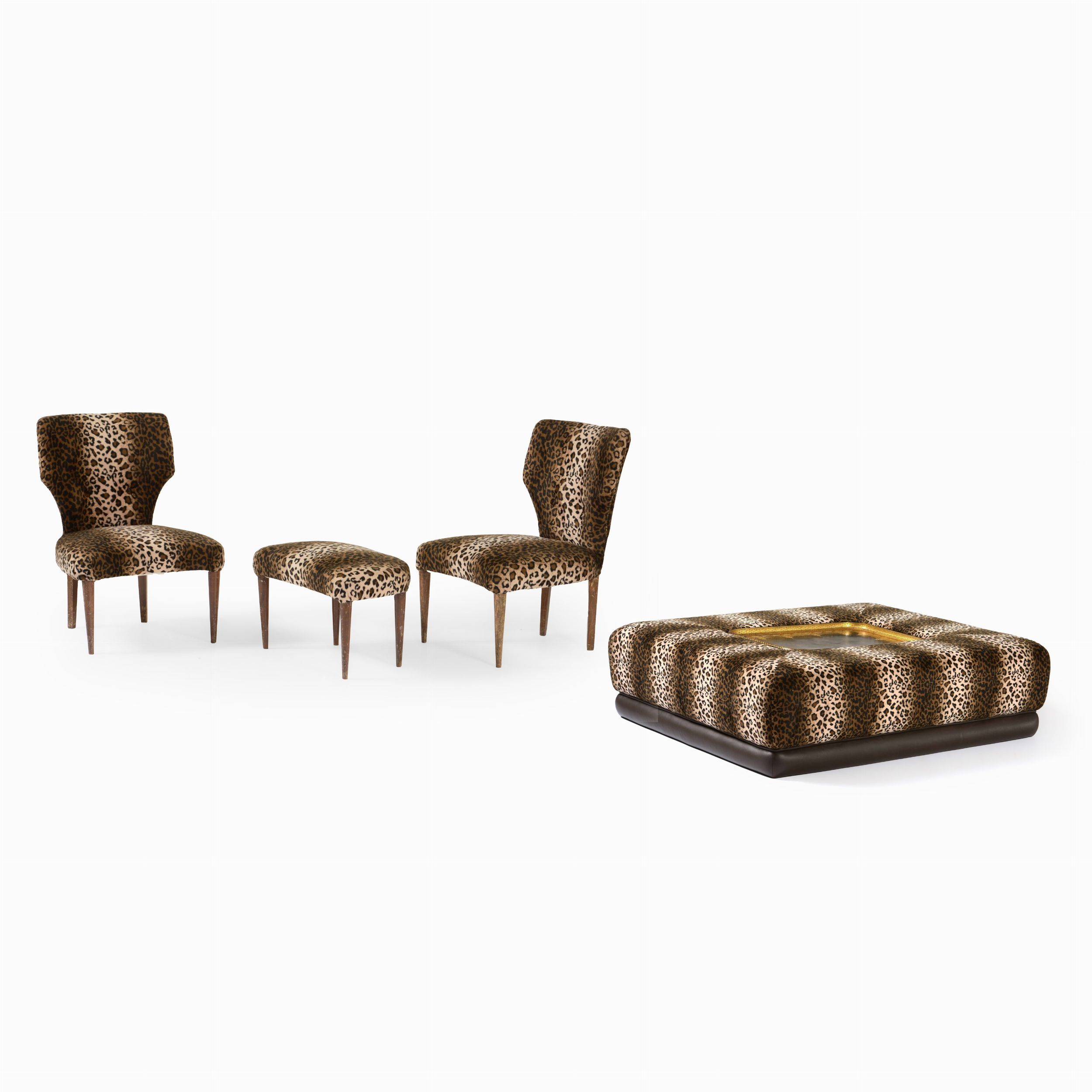 Fornitura da salotto leopardata, XX secolo. Due sedie, poggiapiedi e tavolo basso [..]