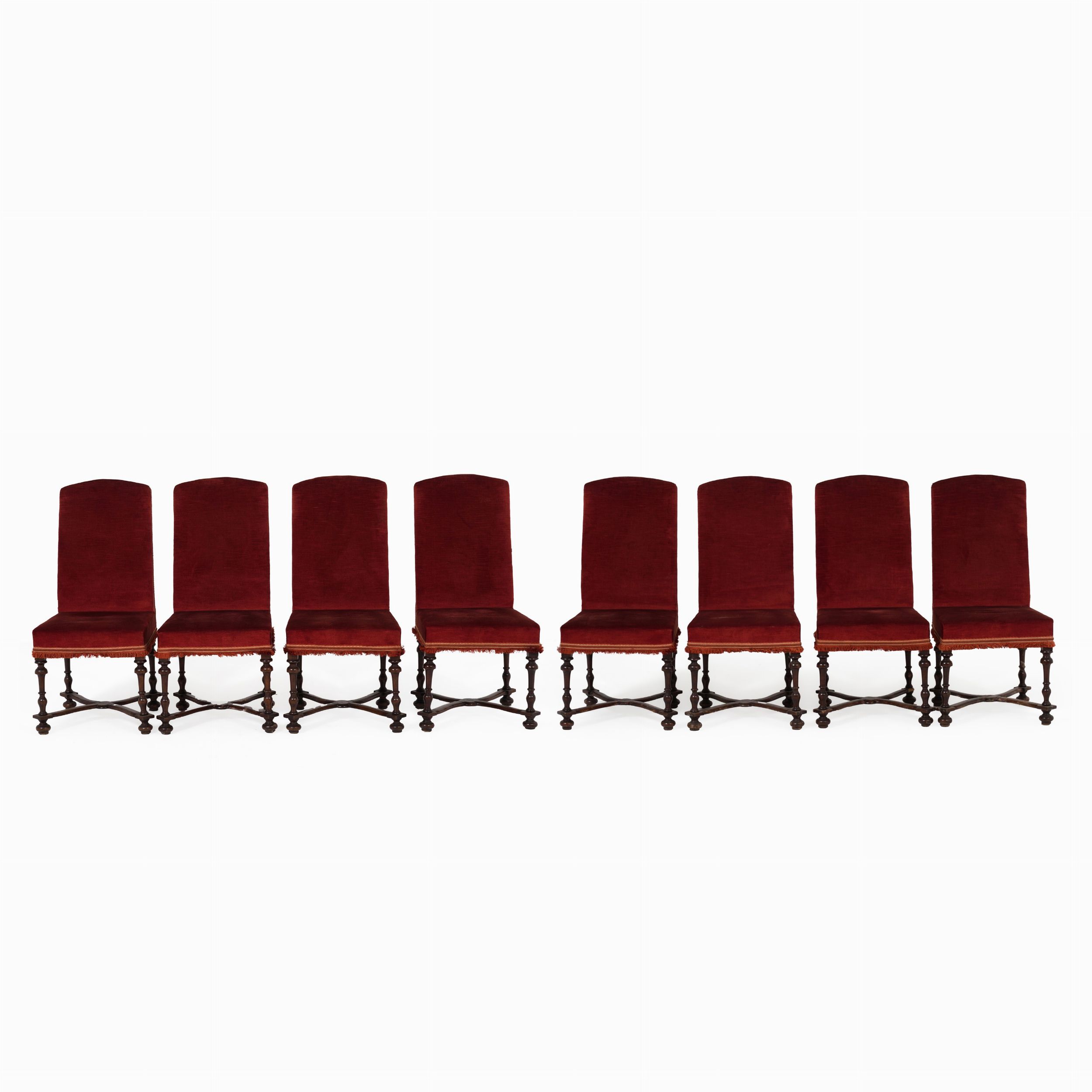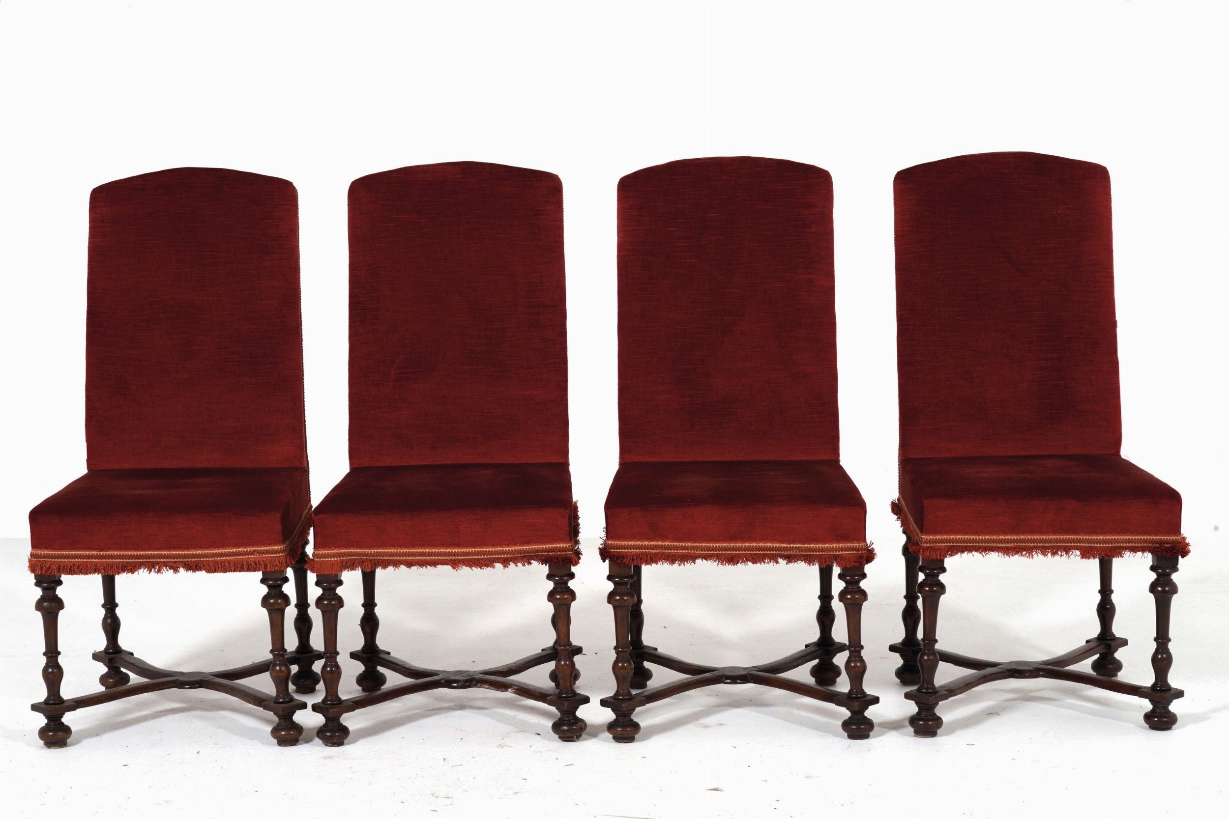 Gruppo di otto sedie rivestite in velluto rosso, XVII-XVIII secolo