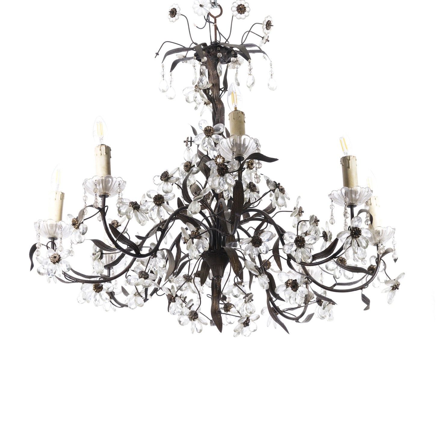 Lampadario in ferro decorato con applicazioni in vetro in forma di fiori, XIX-XX [..]