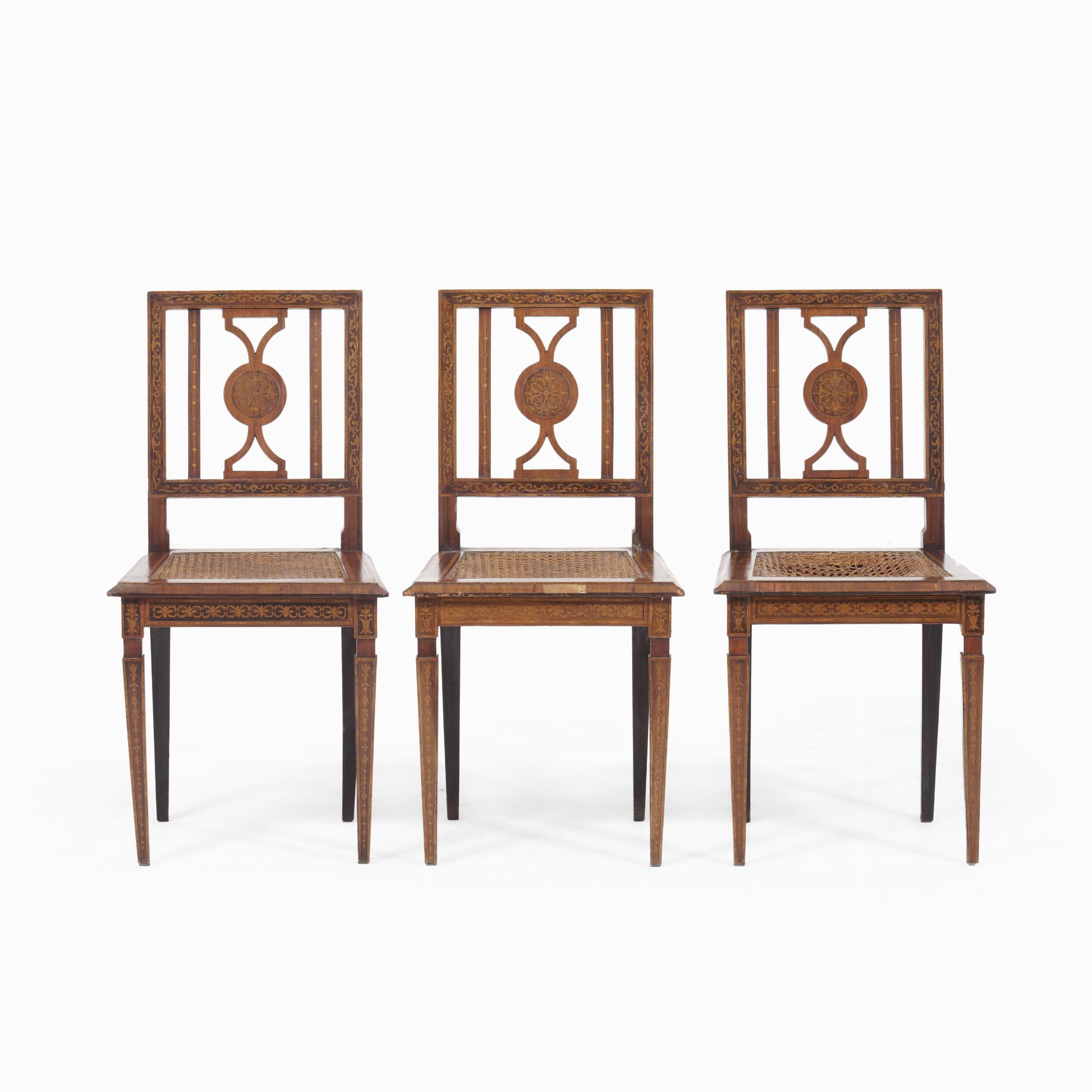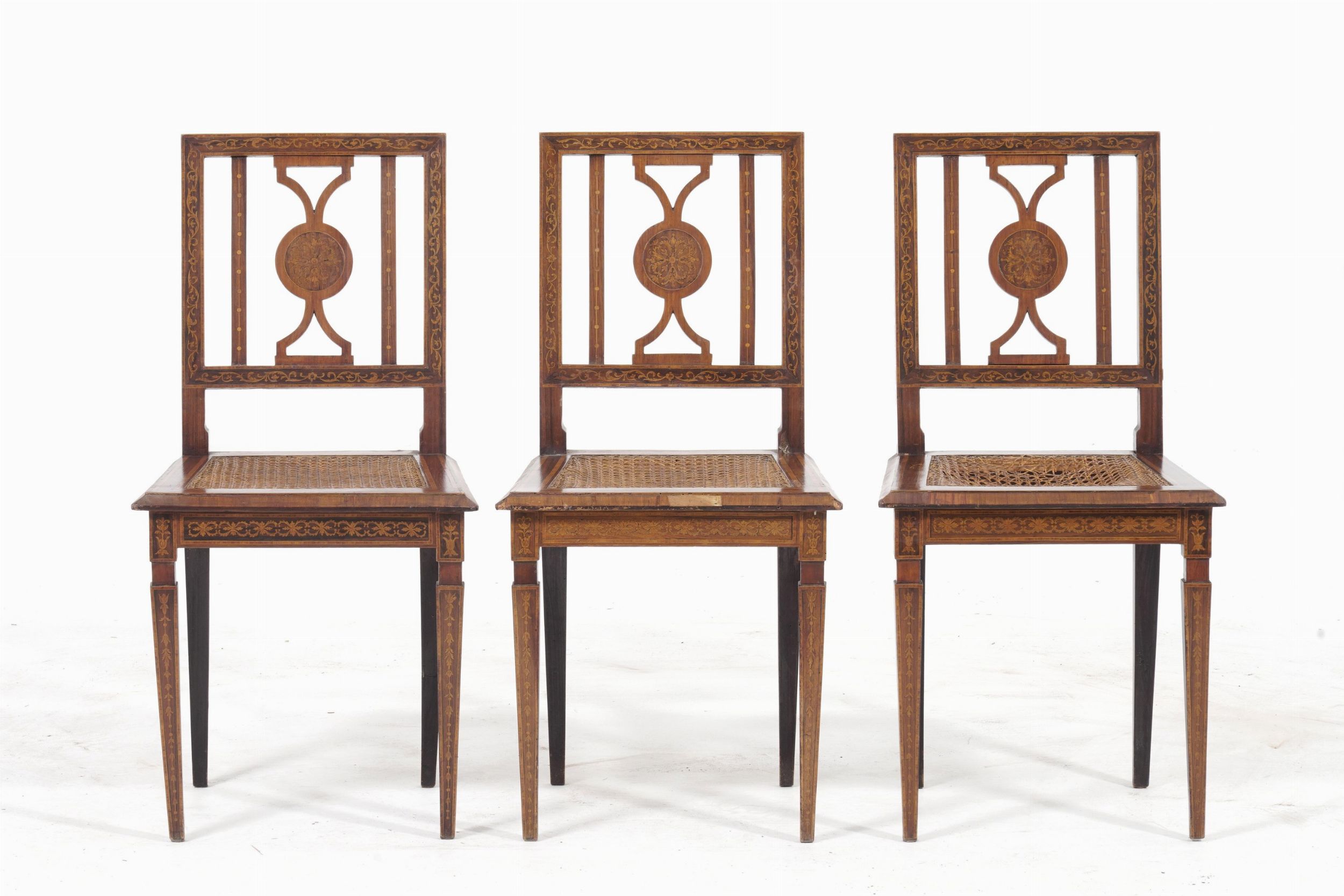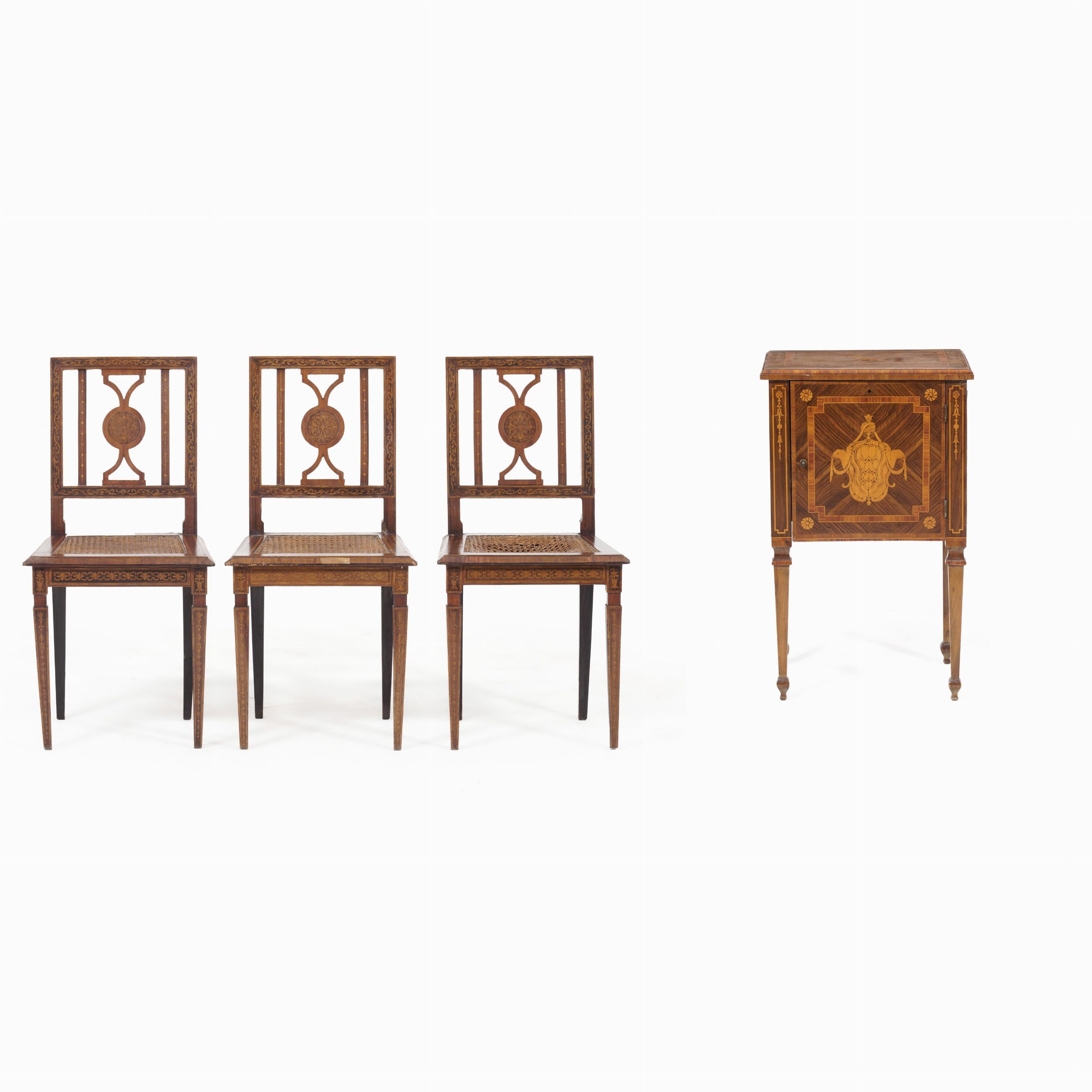 Lotto di tre sedie e un comodino lastronati e intarsiati. XIX-XX secolo