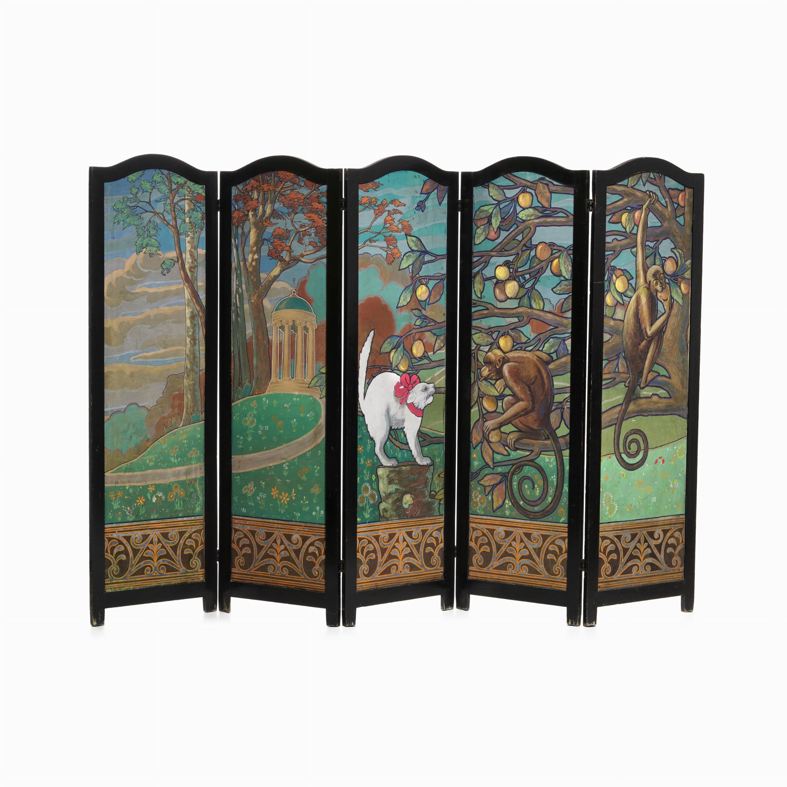 Paravento in legno ebanizzato dipinto in policromia con paesaggio con scimmie e [..]