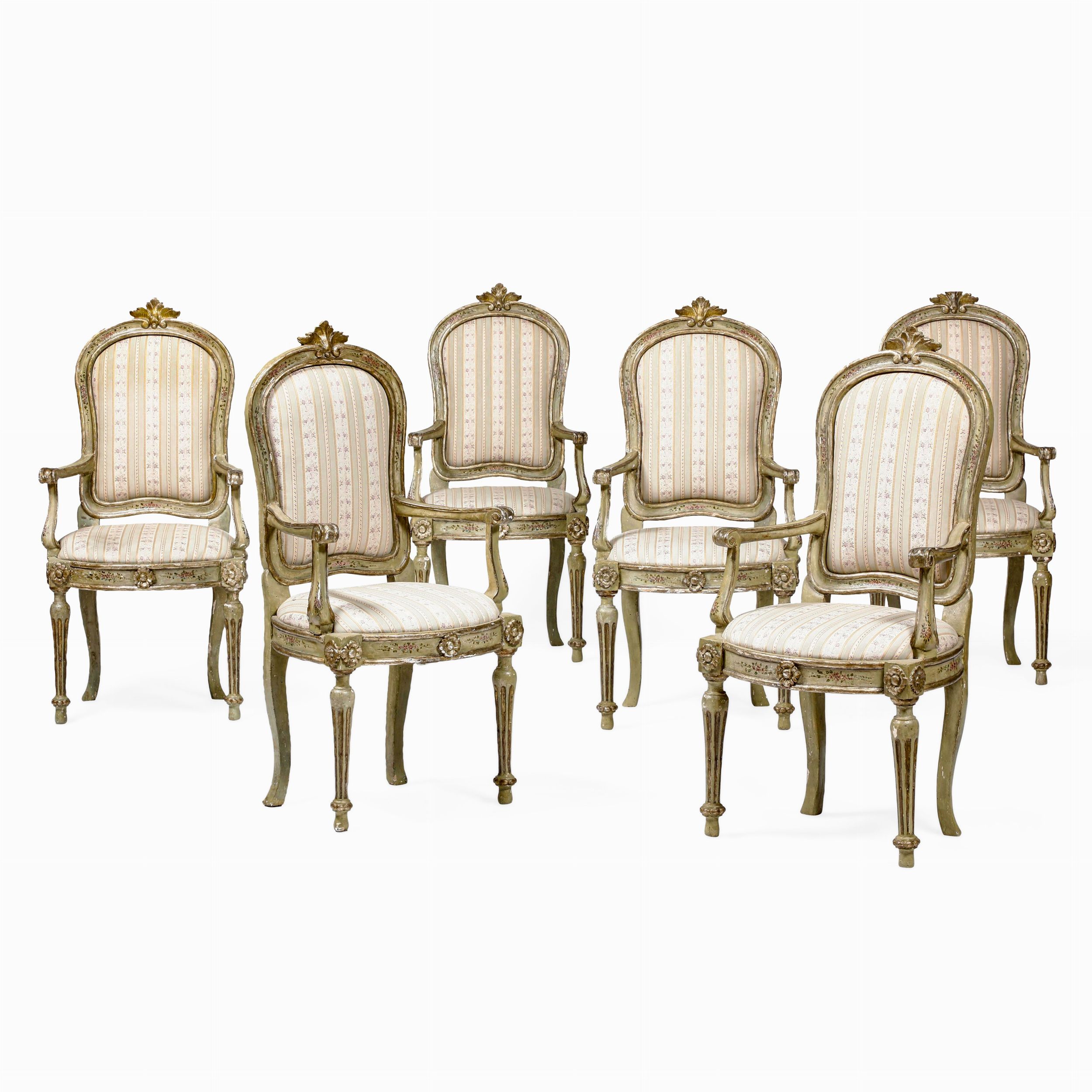Sei poltrone in legno laccato e dorato. XVIII secolo