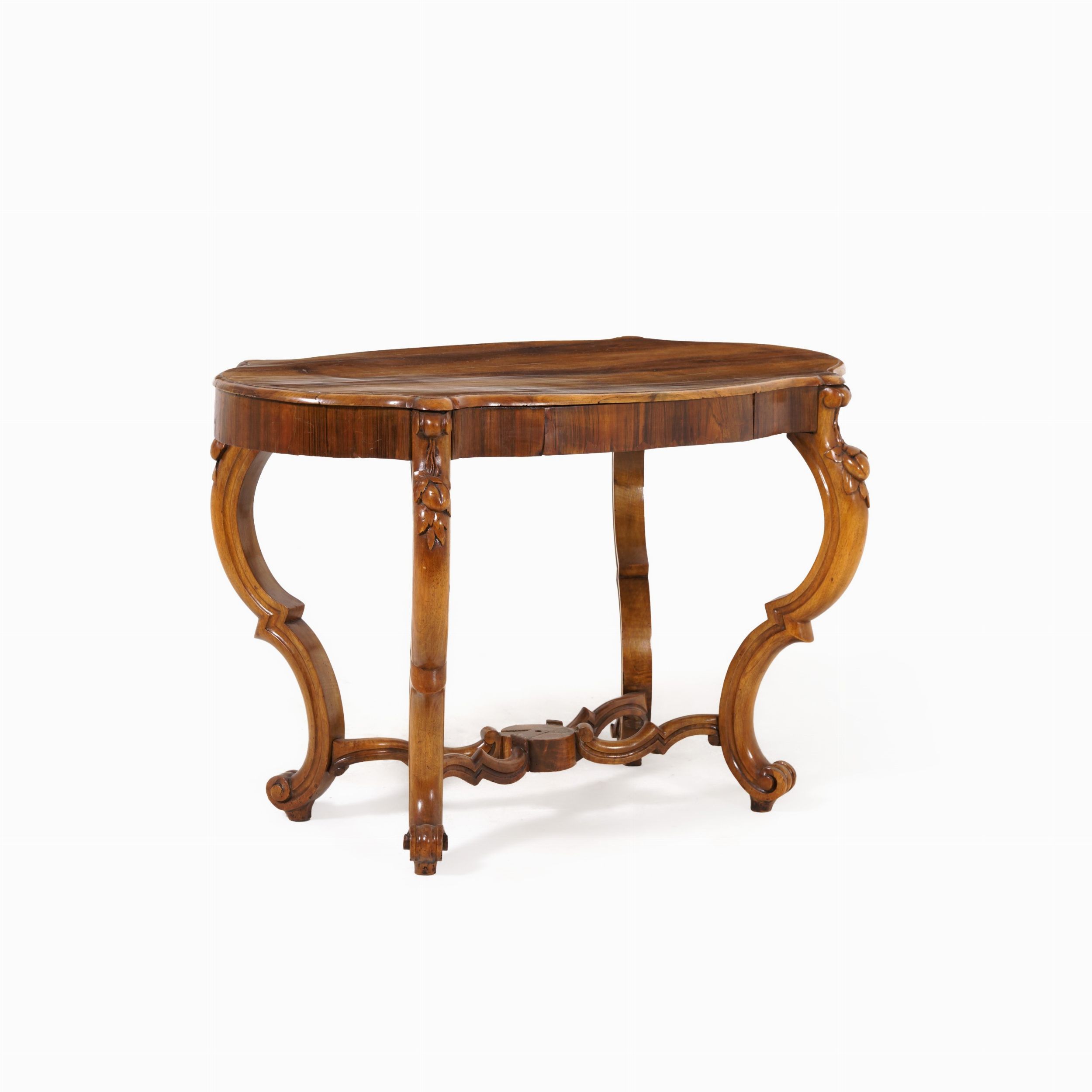 Tavolino da centro in legno intagliato e legno lastronato. XX secolo