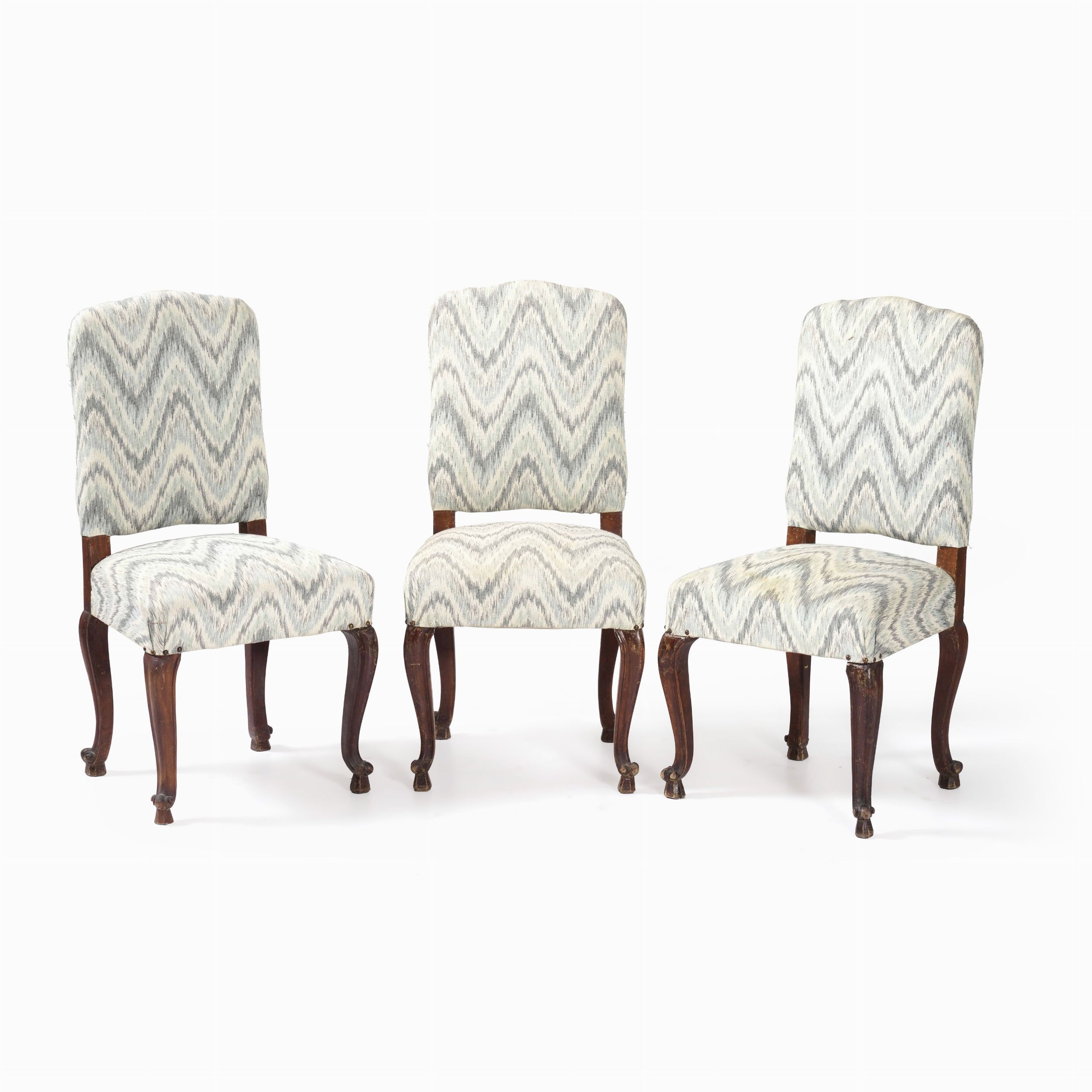 Tre sedie in stile Luigi XV rivestite in tessuto fiammato