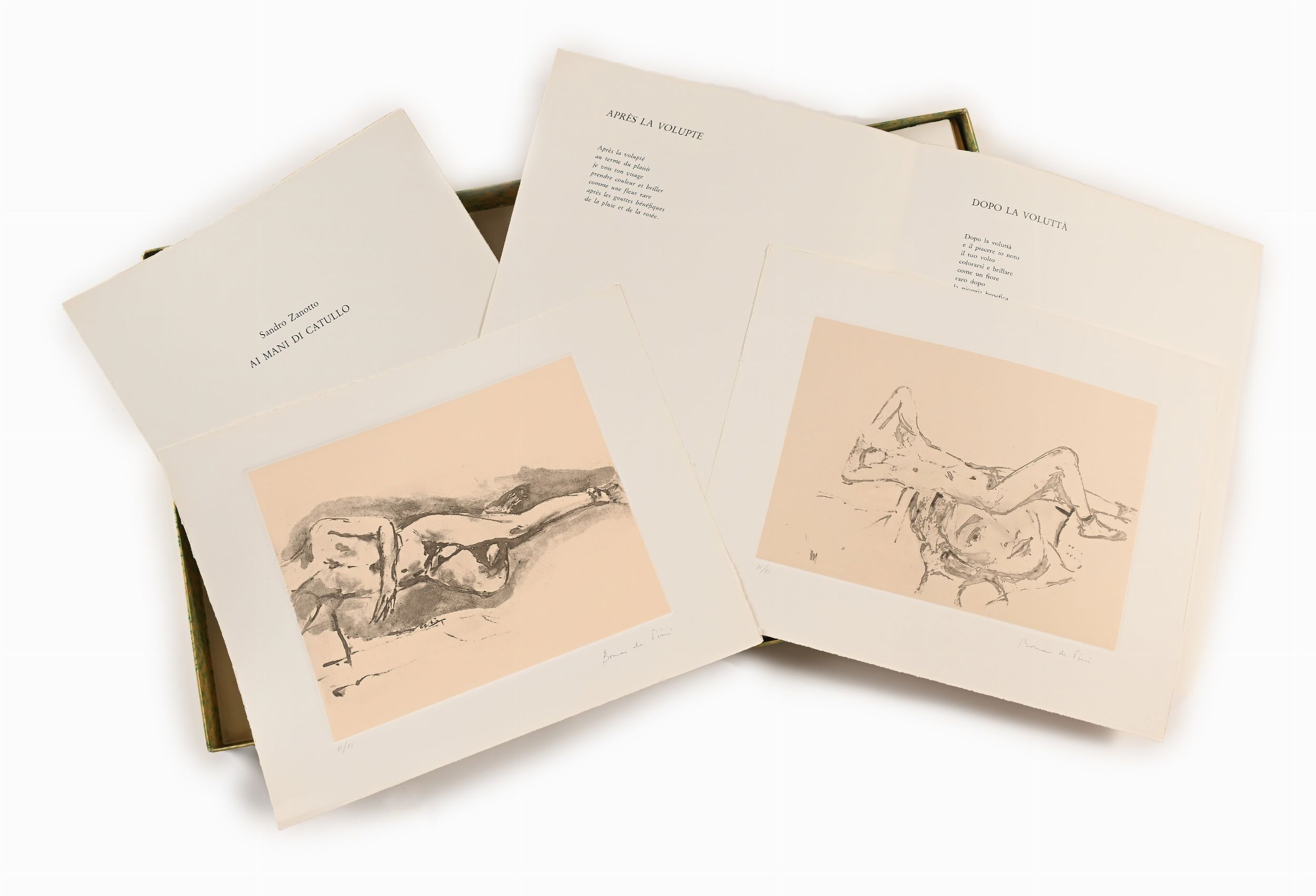 cm 1975 11 incisioni di Bona De Pisis tratte da disegni di Filippo De Pisis più 1 incisione di Bona De Pisis. 11 Poesie inedite di Filippo De Pisis, testi di Sandro Zanzotto e André Pieyre de Mandiargue. Il tutto entro cartella rigida di cartone. Ogni grafica misura cm 50x40 circa ed è firmata Bona De Pisis e numerata VI/XI. Colophon con firma di Bona de Pisis e André Pieyre de Mandiargue.