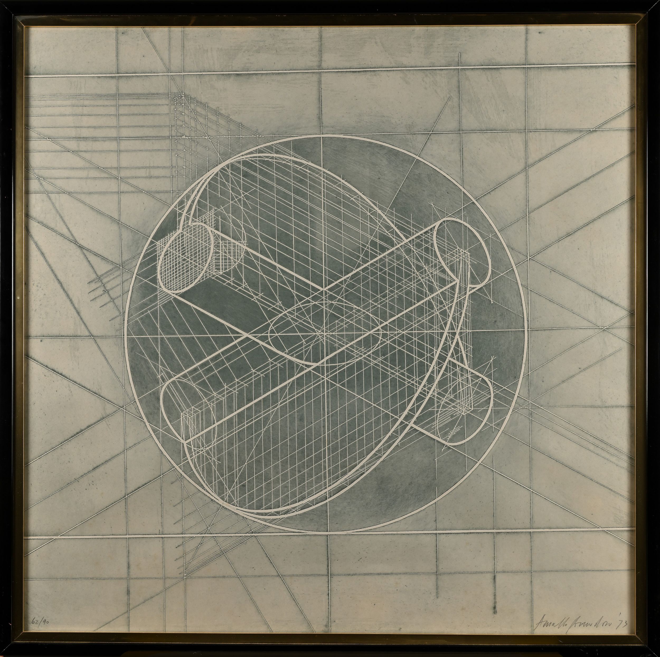 1973 Firma, data e numerazione 'Arnaldo Pomodoro '73, 62/90'. Timbro a secco dello stampatore '2RC'.