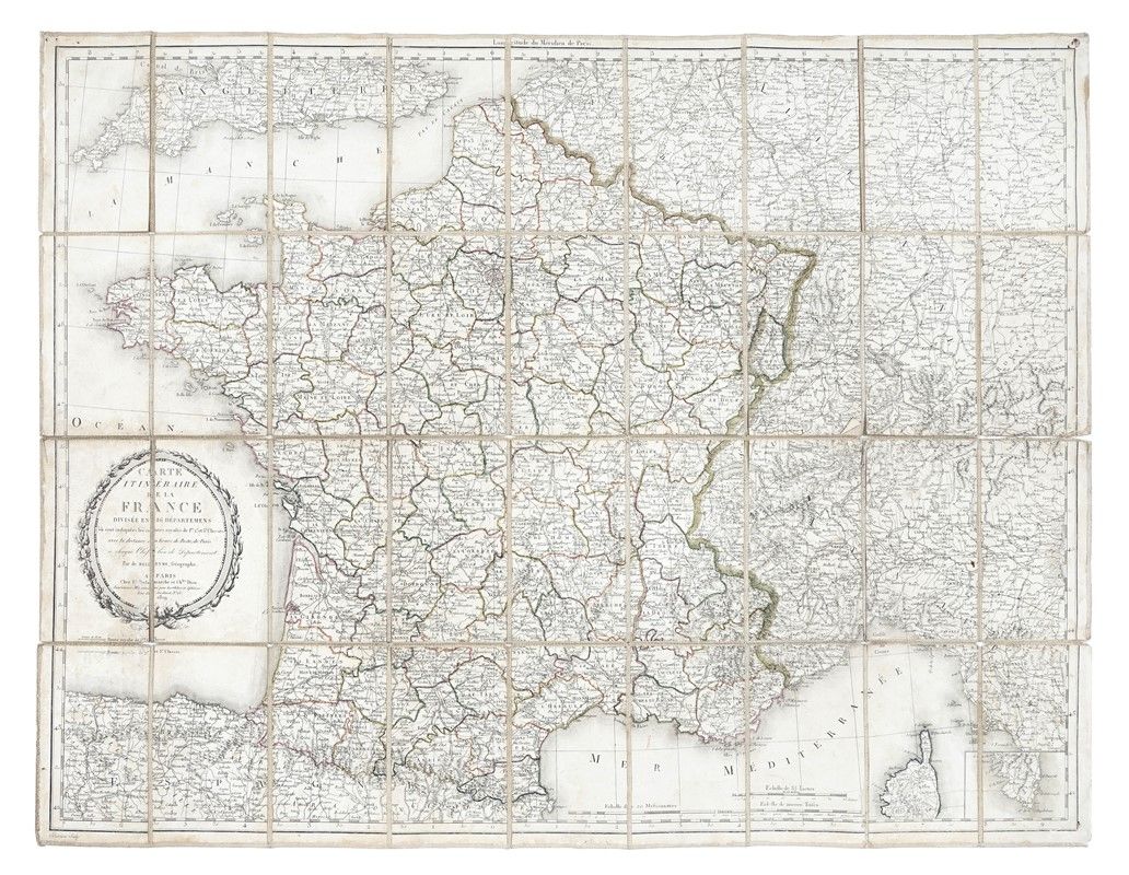 Incisione in rame. Formato aperto: mm 674x1005. Formato chiuso: mm 170x130. SI AGGIUNGE: Pierre de Belleyme, (1747-1819), Carte itinéraire de la France divisée en 86 Départemens ou sont indiquées les routes royales de 1ère, 2e. et 3e. Classes avec la distance en lieues de poste, de Paris. Paris: Chez F. Delamarche et Ch.les Dien, 1819. Formato aperto: mm 665x855. Formato chiuso: mm 170x100.