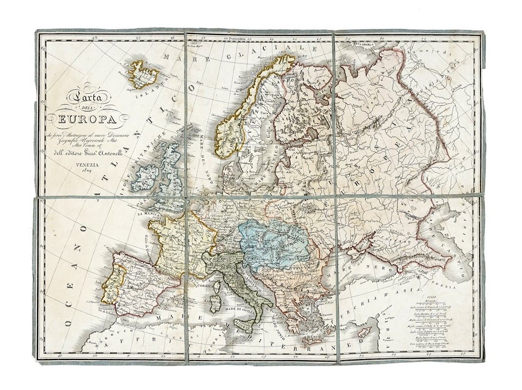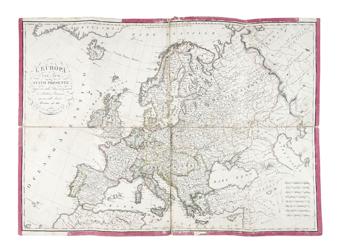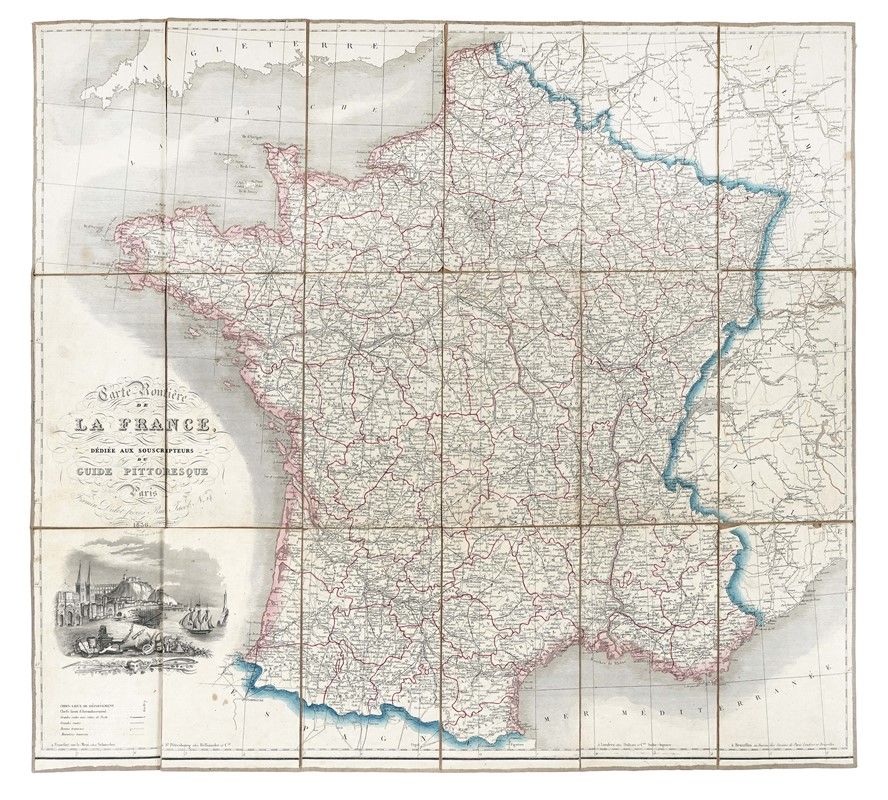 Litografia a colori. Formato aperto: mm 595x668. Formato chiuso: mm 205x120. Grande carta in 18 sezioni montate su tela con veduta in basso a sinistra entro custodia cartonata in carta marmorizzata, fa parte di Guide pittoresque du voyageur en France, publié en 100 livraisons, contenant chacune la description complète d'un département, par une société de gens de lettres, de géographes & d'artistes di Eusebe Girault de Saint Fargeau. SI AGGIUNGONO: Carte des routes de France. 1840. Litografia. Formato aperto: mm 540x668. Formato chiuso: mm 183x118. / L'Europa nel suo stato presente Approvata dalla Direzione Generale di Pubblica Istruzione per uso delle Scuole corretta nel 1825, Milano presso li Frat. Bettalli. Formato aperto: mm 530x750. Formato chiuso: mm 267x195. Carta intelata in 8 fogli a stacco. / Carta dell'Europa che serve d'illustrazione al nuovo Dizionario Geografico-Universale Stat. Stor. Comm. etc., Venezia, Giuseppe Antonelli, 1829. Incisione in rame in coloritura: Formato aperto: mm 355x493. Formato chiuso: mm 180x165. Carta intelata in 8 fogli a stacco.