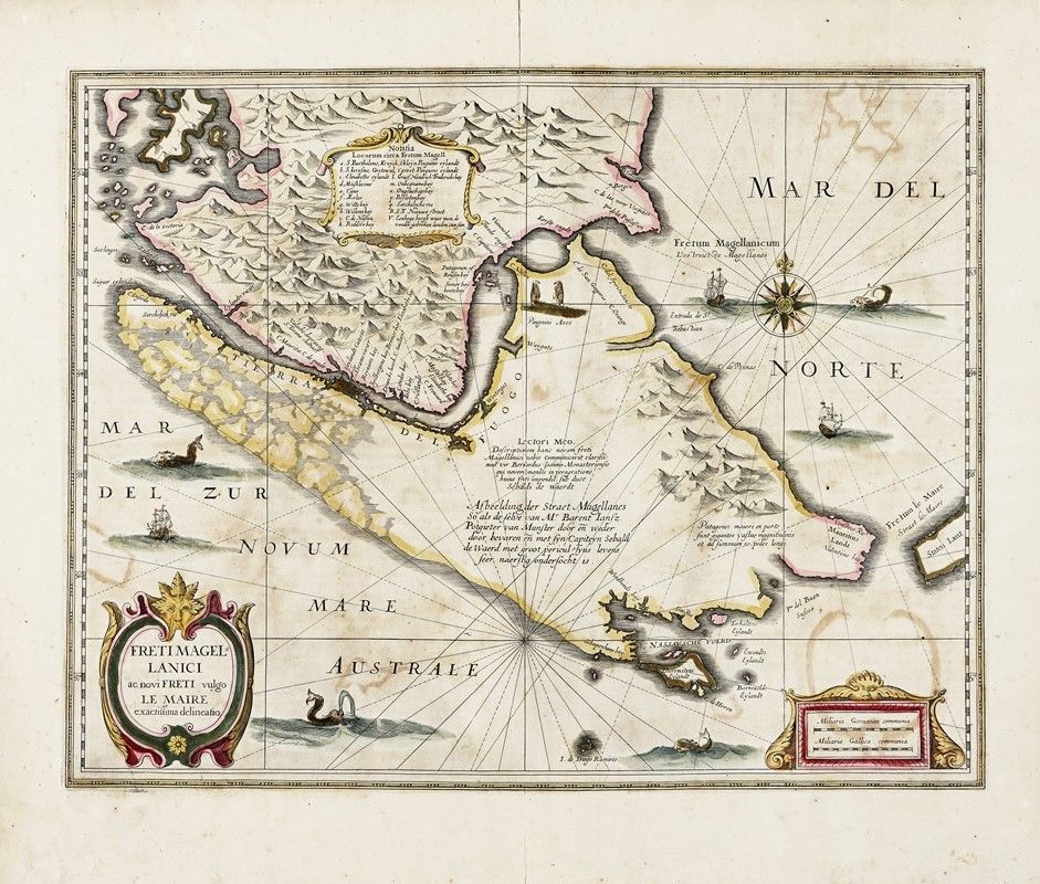 Incisione in rame in coloritura. mm 385x498. Foglio: mm 498x585. Testo latino al verso. Mappa dell'estremità del Sud America con lo Stretto di Magellano e lo Stretto di Le Maire. L'importanza strategica del luogo e le difficoltà di navigazione ne fanno una carta importante. Al centro della Terra del Fuoco si trova il testo che descrive il passaggio di Barent Jansz. Potgieter, che accompagnò il capitano Sebald de Weert nello Stretto nel 1599-1600, prime navi olandesi a navigare attraverso lo Stretto di Magellano.
