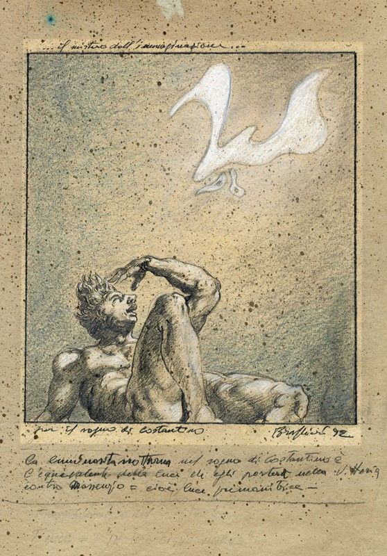 Matita e carboncini colorati su carta. mm 445x320. Firmata e datata in basso a destra. Titolata ai margini del riquadro illustrato. Iscrizione "La luminosità notturna nel sogno di Costantino è l'equivalente della luce che egli porterà nella vittoria contro Massenzio = cioè luce premonitrice" a matita lungo il margine inferiore. Controtitolata a matita al verso.