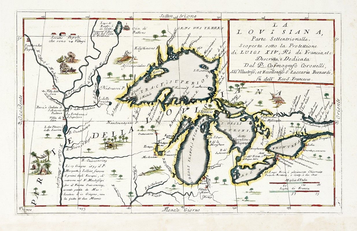 Incisione in rame in coloritura. mm 260x428. Foglio: mm 348x495. Dalla seconda edizione dell' Atlante veneto (1695-97). Mappa che raffigura la regione dei Grandi Laghi così come descritta nei rapporti dei missionari Gesuiti francesi padri La Salle, Joliet, Hennepin e altri che dal Quebec condussero spedizioni in tutta la regione dei Grandi Laghi e lungo il fiume Mississippi. Viene indicato in basso il fiume de Chekagou come eponimo di Chicago. La rappresentazione di questa estesa area lacustre appare sufficientemente esatta per una mappa del XVII secolo, anche se compaiono alcune incongruenze come l'alligatore che mangia uno degli indigeni vicino al confine tra il Minnesota e il Canada.