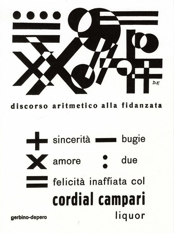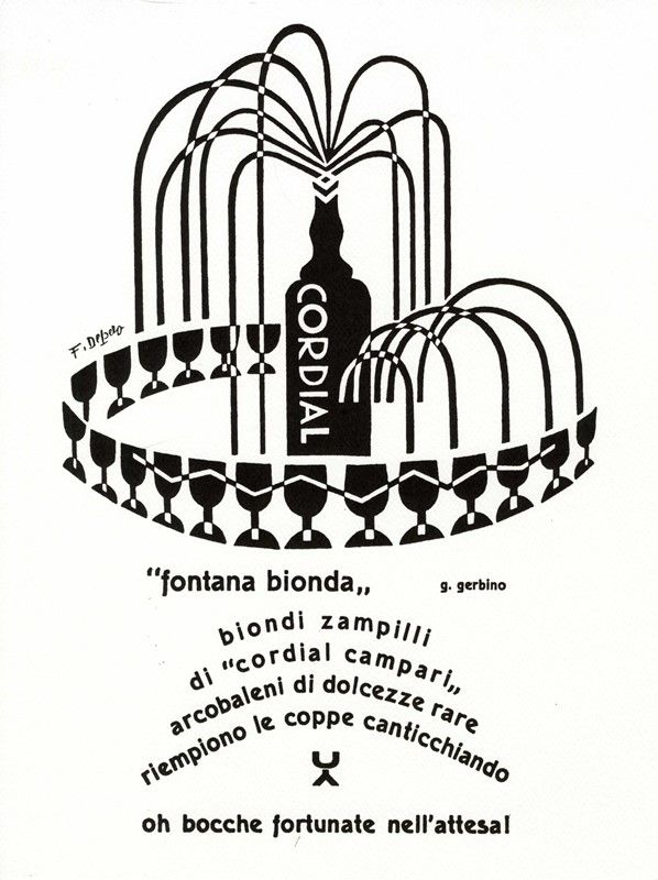Giclée. mm 400x300 cad. Tirature postume dei celebri manifestini di Fortunato Depero per Campari, ovvero Discorso aritmetico alla fidanzata, Se la pioggia fosse Bitter Campari e Fontana bionda.
