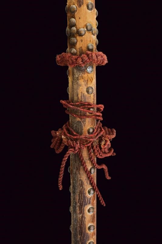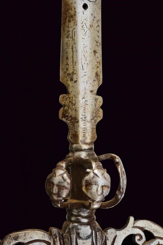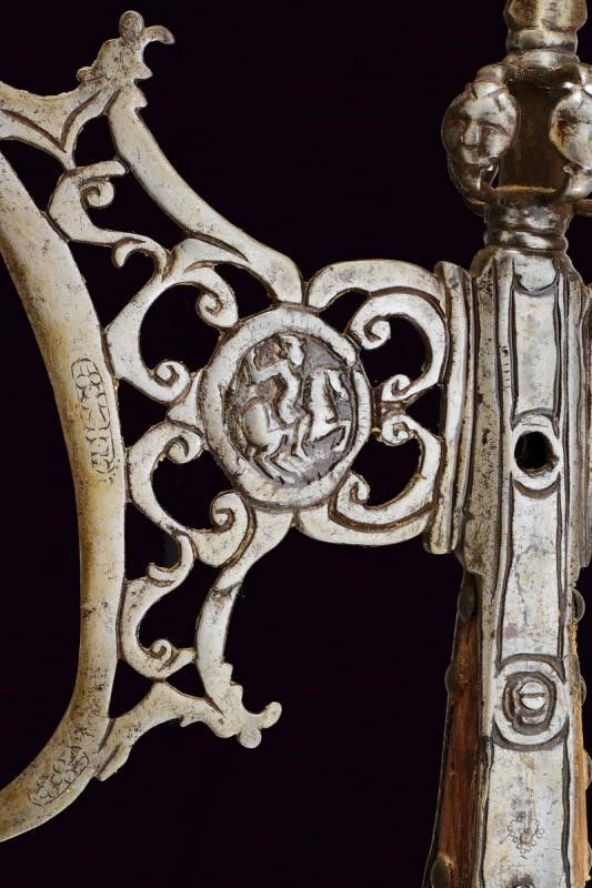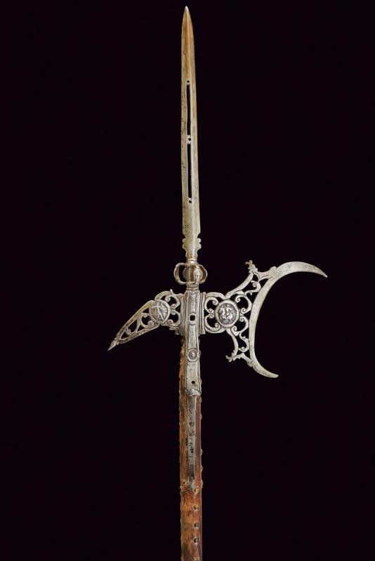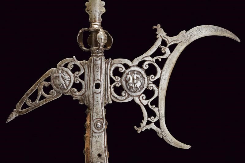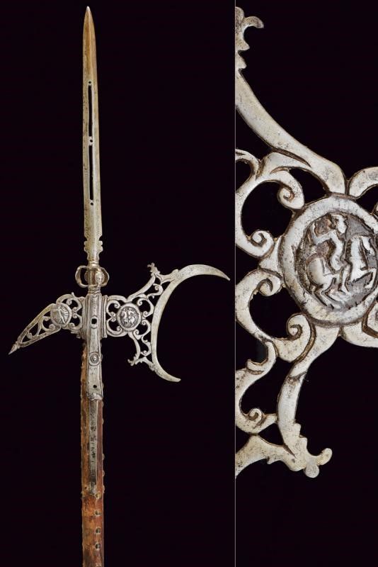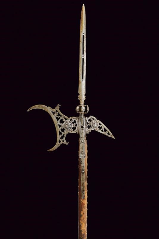 Italia settentrionale, lunghezza 194 cm. Lunga e snella cuspide con resti di incisioni, a due fili con trafori al centro ed intagli alla base, che poggia sopra lanterna a quattro placche (altre due mancanti) intagliate con mascheroni. Scure a taglio concavo riccamente traforata e al centro medaglione con cavaliere su cavallo (su entrambe le facce), resti di incisioni. Becco lavorato en suite. Bandelle di restauro. Su affusto cilindrico in legno che conserva resti del rivestimento in tessuto e borchie in metallo. La base di restauro. Questo lotto è importato da un Paese extra UE e comporta una tassazione aggiuntiva rispetto alla commissione della casa d'aste e alla tassa sul servizio. Di conseguenza, la commissione totale, comprensiva di tutte le tasse, ammonta al 35%.