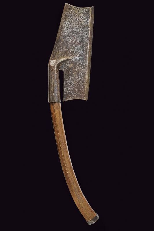 Europa, lunghezza 72.5 cm. Pesante in testa in ferro con scure munita di lungo taglio (quasi dritto); resti di una marcatura. Gorbia faccettata. Su affusto ligneo con base in ferro. Questo lotto è importato da un Paese extra UE e comporta una tassazione aggiuntiva rispetto alla commissione della casa d'aste e alla tassa sul servizio. Di conseguenza, la commissione totale, comprensiva di tutte le tasse, ammonta al 35%.