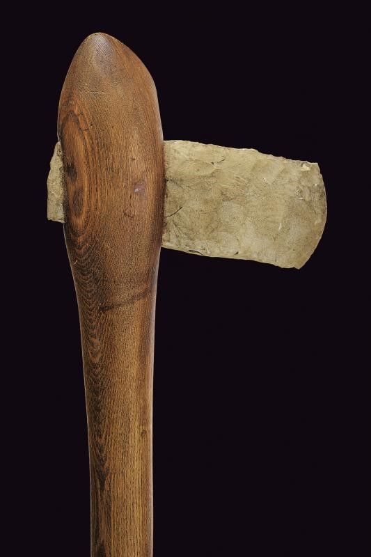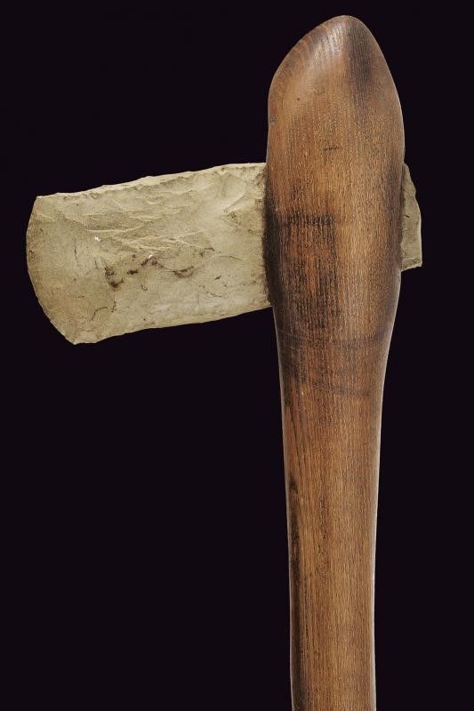 Danimarca, lunghezza 68 cm. Ascia in pietra con taglio tondo, montata su un'asta in legno moderno. Questo lotto è importato da un Paese extra UE e comporta una tassazione aggiuntiva rispetto alla commissione della casa d'aste e alla tassa sul servizio. Di conseguenza, la commissione totale, comprensiva di tutte le tasse, ammonta al 35%.