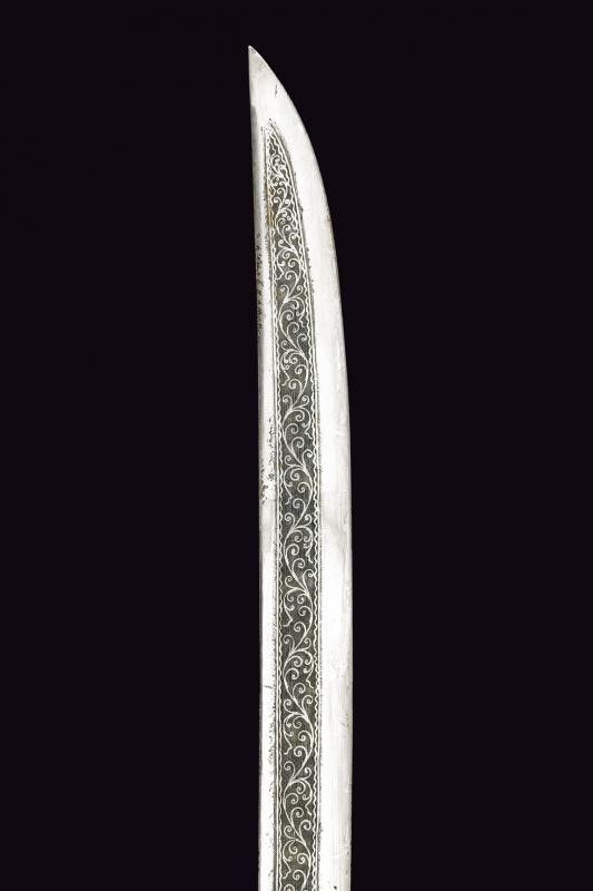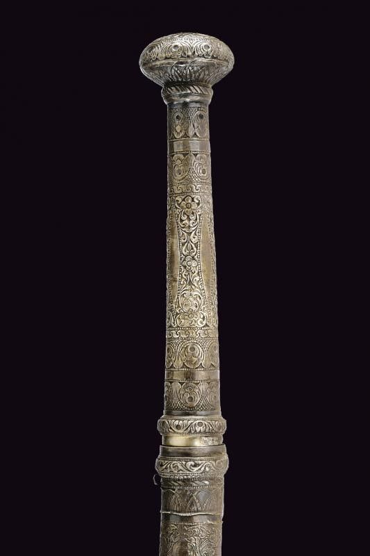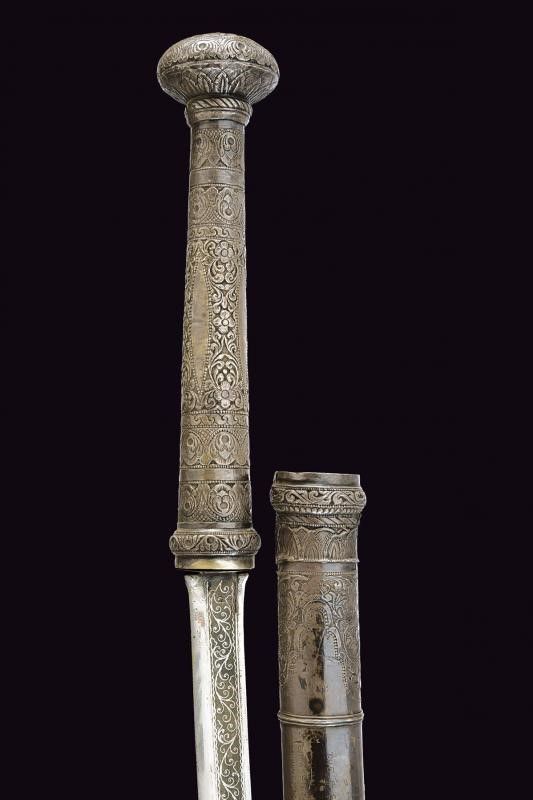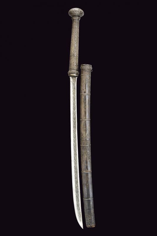 Burma, lunghezza 86 cm. 1900 circa Lama leggermente curva a un filo, decorata su entrambi i lati e su tutta la lunghezza (parzialmente anche al dorso) a volute su fondo scuro. Impugnatura e fodero in legno rivestito in lamina di argento riccamente inciso a motivi floreali. Il fodero con alcune mancanze e una dedica di epoca successiva. Questo lotto è importato da un Paese extra UE e comporta una tassazione aggiuntiva rispetto alla commissione della casa d'aste e alla tassa sul servizio. Di conseguenza, la commissione totale, comprensiva di tutte le tasse, ammonta al 35%.