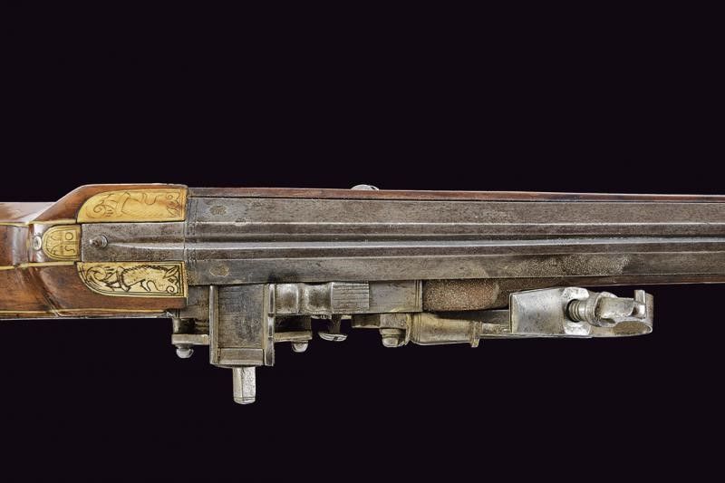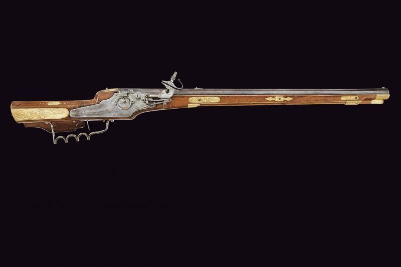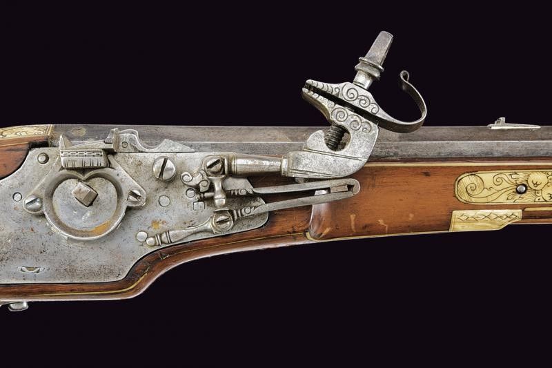 XVII Secolo Canna ottagonale rigata, la base con cornice e due punzoni 'OS' entro scudetto, lunga scanalatura che parte dalla codetta, alzo in ferro e mirino in ottone, cal. 16 mm. Batteria a ruota esterna con cartella piatta, la copertura della ruota a forma di cuore, molla e cane incisi ed intagliati, scodellino con copriscodellino a scatto; all'interno alcune incisioni. Cassa intera in legno di frutto decorato con placche e tarsie in osso con incisioni a motivi floreali, le due lastre ai lati della codetta con animali grotteschi e sul retro piccolo scudetto con monogramma 'OS' (il quale indica probabilmente che si tratta del medesimo maestro che ha lavorato la canna). Il rivestimento del patch-box in osso finemente inciso con una coppia di nobili. Ponticello anatomico in ferro. Grilletto con stecher funzionate. Bacchetta in legno con battipalla in osso. Questo lotto è importato da un Paese extra UE e comporta una tassazione aggiuntiva rispetto alla commissione della casa d'aste e alla tassa sul servizio. Di conseguenza, la commissione totale, comprensiva di tutte le tasse, ammonta al 35%.
