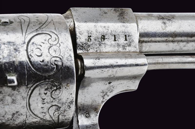 1870 circa Canna rigata, di sezione tonda, marcata in argento 'Fa Ro. Arrate Eibar'. Basa ottagonale marcata con matricola '56xx', '12', 'B' e 'Ro'. Cal. 11 mm. Tamburo a sei colpi finemente inciso a rocaille. Castello decorato en suite. Sportellino di caricamento, estrattore e grilletto pieghevole. Guancette in legno scolpite a palmette e microzigrinate; piccole mancanze. Anello di sospensione. Questo lotto è importato da un Paese extra UE e comporta una tassazione aggiuntiva rispetto alla commissione della casa d'aste e alla tassa sul servizio. Di conseguenza, la commissione totale, comprensiva di tutte le tasse, ammonta al 35%.
