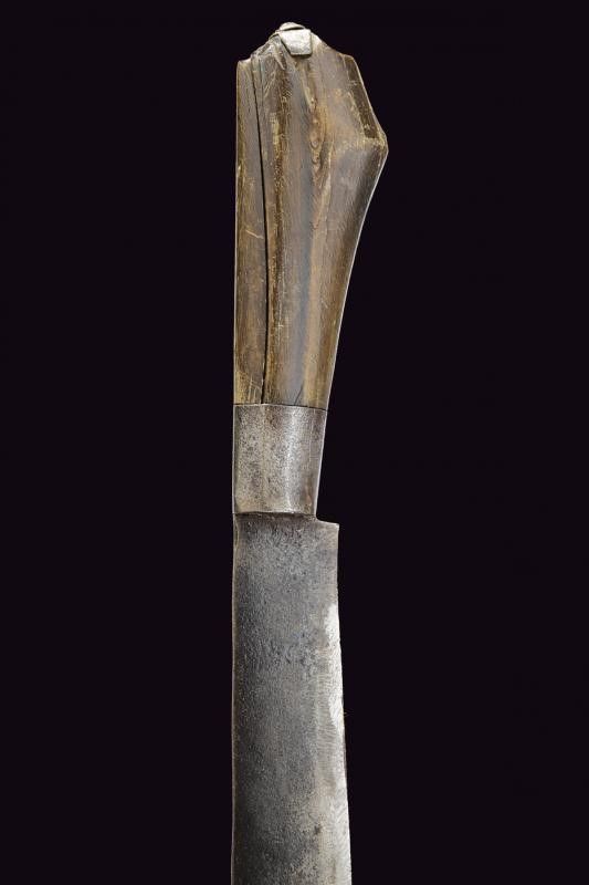 Guam, lunghezza 63.3 cm. 1900 circa Lunga lama dritta a un filo. Impugnatura faccettata in corno, ghiera e cappetta in ferro. Questo lotto è importato da un Paese extra UE e comporta una tassazione aggiuntiva rispetto alla commissione della casa d'aste e alla tassa sul servizio. Di conseguenza, la commissione totale, comprensiva di tutte le tasse, ammonta al 35%.