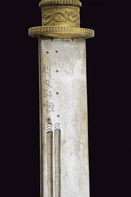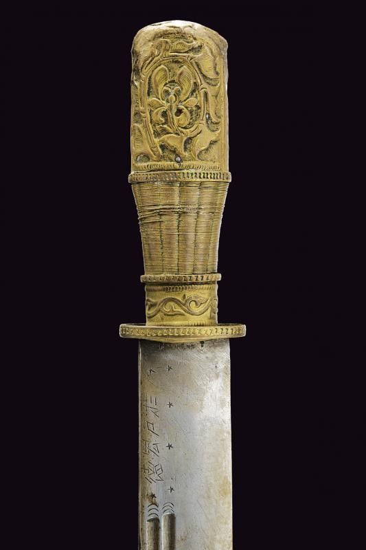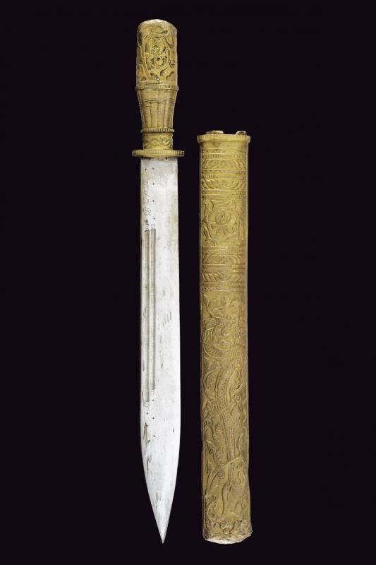 Tibet, lunghezza 48.5 cm. inizio del XX Sec. Robusta lama a un filo, duplice scanalatura e iscrizioni in caratteri asiatici. Impugnatura e fodero rivestiti in lamina di ottone sbalzato con drago e a motivi floreali. Attacchi in cuoio. Questo lotto è importato da un Paese extra UE e comporta una tassazione aggiuntiva rispetto alla commissione della casa d'aste e alla tassa sul servizio. Di conseguenza, la commissione totale, comprensiva di tutte le tasse, ammonta al 35%.
