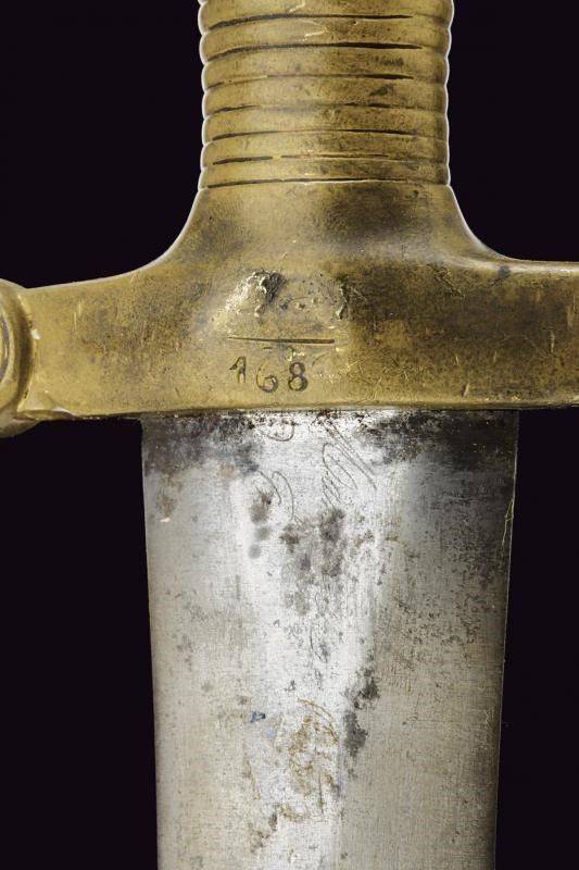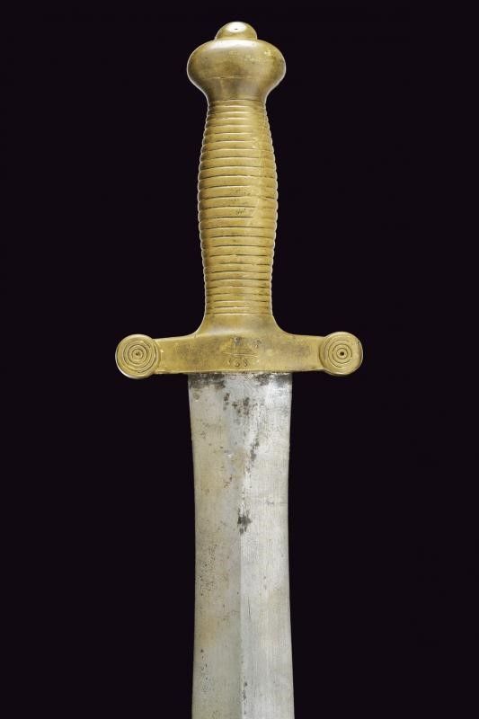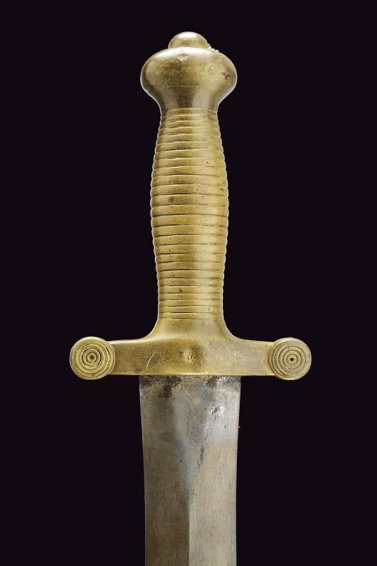 Francia, lunghezza 63.8 cm. Lama dritta costolata, a due fili, al forte marcata, resti della firma. Fornimento massiccio in ottone numerato '168' e marcato con ancora. Fodero in cuoio con fornimenti in ottone. Questo lotto è importato da un Paese extra UE e comporta una tassazione aggiuntiva rispetto alla commissione della casa d'aste e alla tassa sul servizio. Di conseguenza, la commissione totale, comprensiva di tutte le tasse, ammonta al 35%.