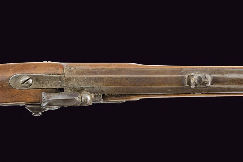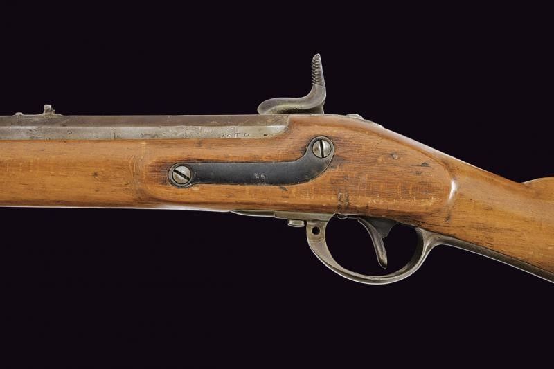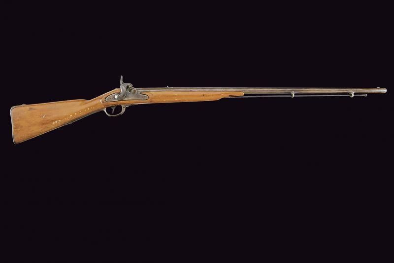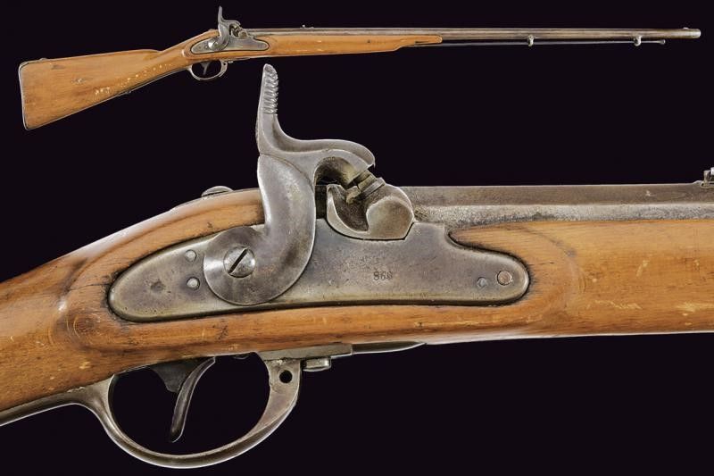 Austria, lunghezza 133.5 cm. 1860 Canna liscia a due ordini con alzo e mirino, cal. 15 mm. Batteria datata '860' e con punzone imperiale. Mezza cassa in legno con fornimenti e bacchetta in ferro. Questo lotto è importato da un Paese extra UE e comporta una tassazione aggiuntiva rispetto alla commissione della casa d'aste e alla tassa sul servizio. Di conseguenza, la commissione totale, comprensiva di tutte le tasse, ammonta al 35%.
