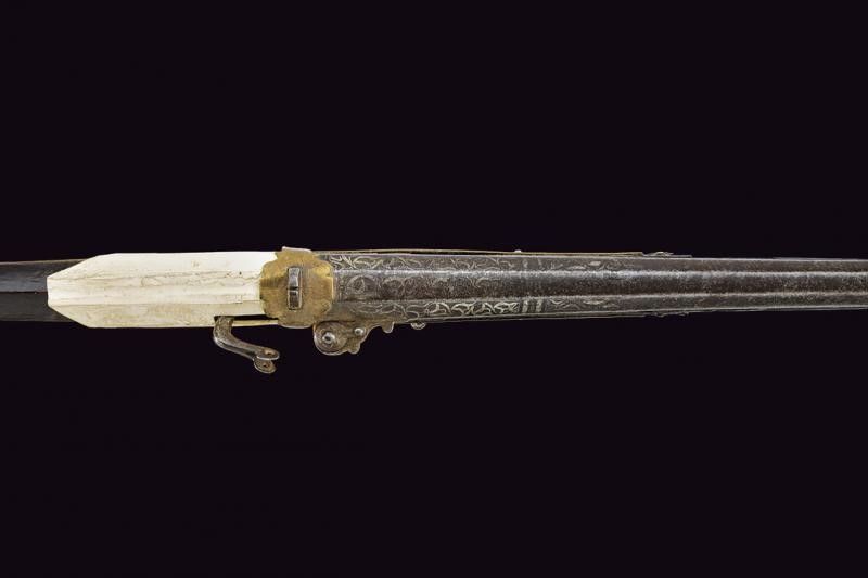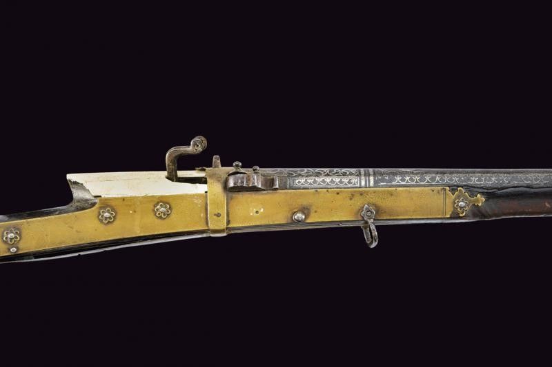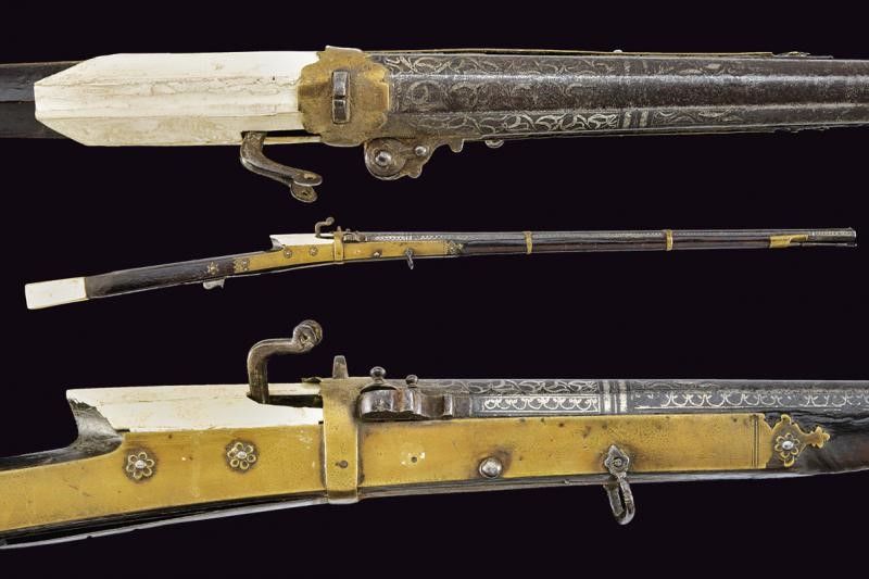 India, lunghezza 122 cm. Fine XVIII inizio XIX Secolo Canna ottagonale liscia, le estremità con decorazioni floreali in argento, mirino, cal. 12 mm. Sul lato destro con scodellino e copriscodellino decorato; la codetta con fascia in ottone e alzo in ferro. Cassa intera in legno con snello calcio faccettato, la parte intorno alla codetta e il segmento finale del calcio di restauro moderno in plastica. Fornimenti laterali in ottone decorato con rosette. Grilletto e cane e bacchetta in ferro. Difetti e mancanze. Questo lotto è importato da un Paese extra UE e comporta una tassazione aggiuntiva rispetto alla commissione della casa d'aste e alla tassa sul servizio. Di conseguenza, la commissione totale, comprensiva di tutte le tasse, ammonta al 35%.