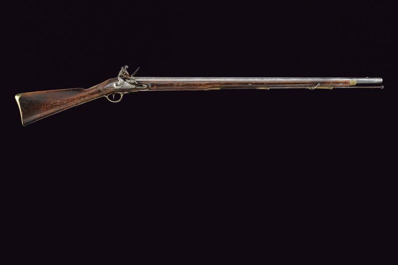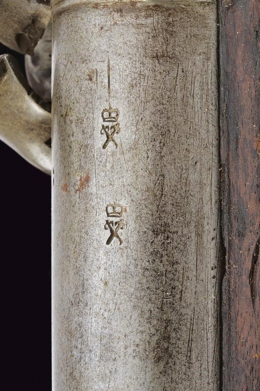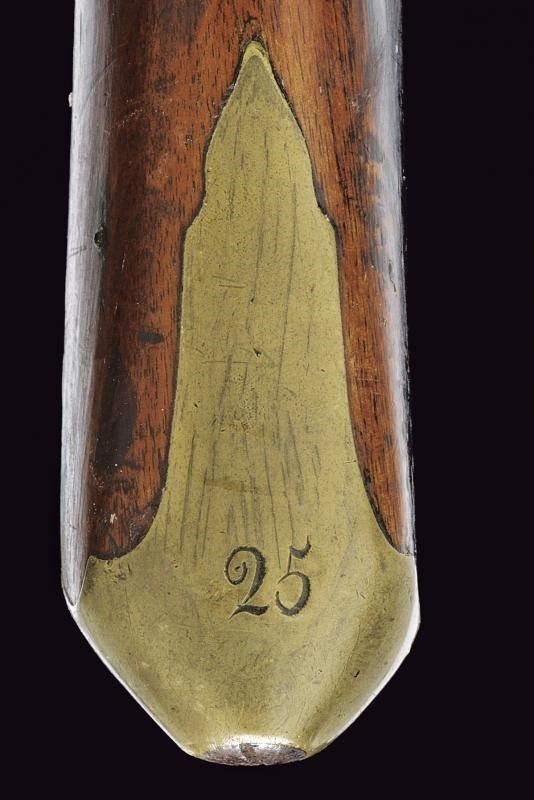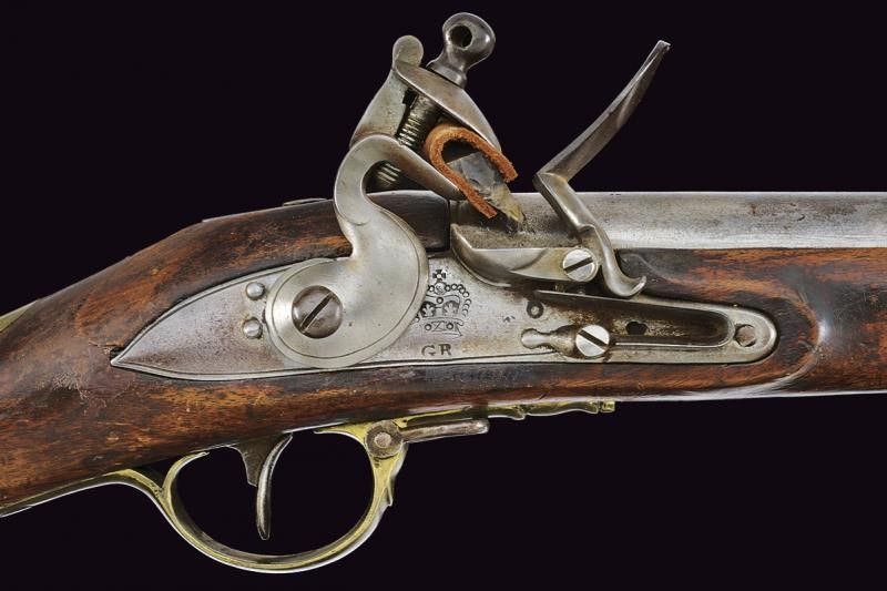 Inghilterra, lunghezza 138.5 cm. Canna liscia tonda, con culatta recante cornice tonda e punzoni del banco di prova, dotata di mirino (che funge anche da attacco per la baionetta), cal. 18 mm. Batteria a pietra focaia marcata con 'GR' coronato, i bordi della cartella e del cane con singola linea. Cassa intera in legno (restauri) con fornimenti lisci in ottone. Bacchetta in ferro. Questo lotto è importato da un Paese extra UE e comporta una tassazione aggiuntiva rispetto alla commissione della casa d'aste e alla tassa sul servizio. Di conseguenza, la commissione totale, comprensiva di tutte le tasse, ammonta al 35%.