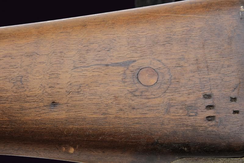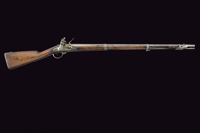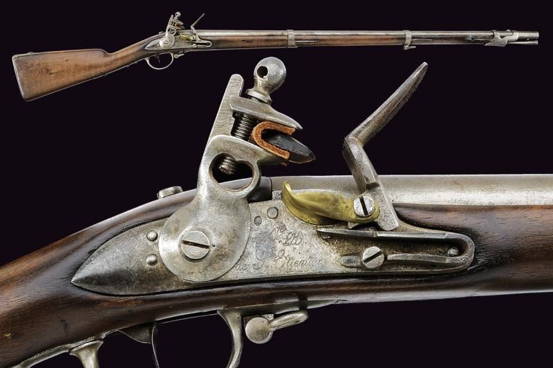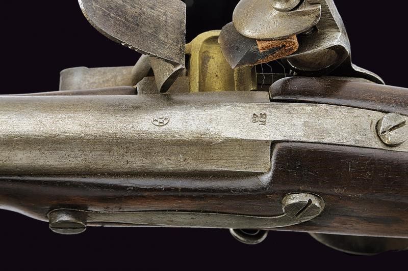 Canna liscia, tonda con base quadra marcata con punzone 'MB' sotto corona e con punzone del banco di prova di Liegi, mirino ed attacco per la baionetta, cal. 18 mm. Batteria a pietra focaia con marcatura della manifattura reale di St. Etienne e punzone 'M', scodellino in ottone. Cassa intera in legno (mancanze e piccoli restauri), calcio con timbri e numeri poco leggibili. Fornimenti e bacchetta in ferro. Questo lotto è importato da un Paese extra UE e comporta una tassazione aggiuntiva rispetto alla commissione della casa d'aste e alla tassa sul servizio. Di conseguenza, la commissione totale, comprensiva di tutte le tasse, ammonta al 35%.