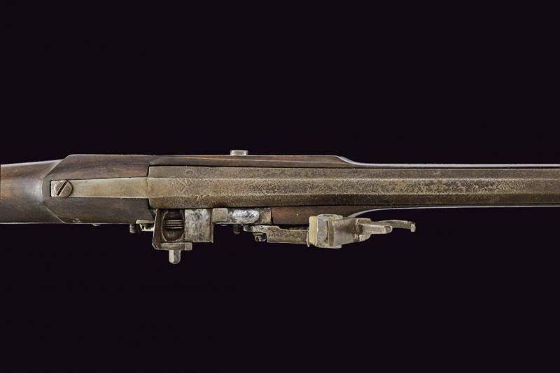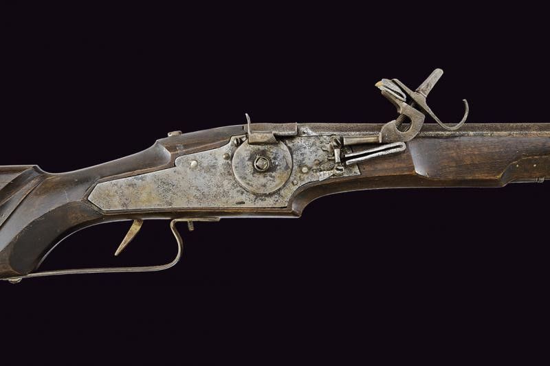 Germania, lunghezza 151 cm. Canna liscia a due ordini con resti di un punzone alla base, cal. 18 mm. Batteria a ruota esterna con cartella piatta, la grande molla all'interno di sostituzione moderna. Cassa intera in legno, la parte anteriore di restauro. Fornimenti e bacchetta in ferro. Questo lotto è importato da un Paese extra UE e comporta una tassazione aggiuntiva rispetto alla commissione della casa d'aste e alla tassa sul servizio. Di conseguenza, la commissione totale, comprensiva di tutte le tasse, ammonta al 35%.