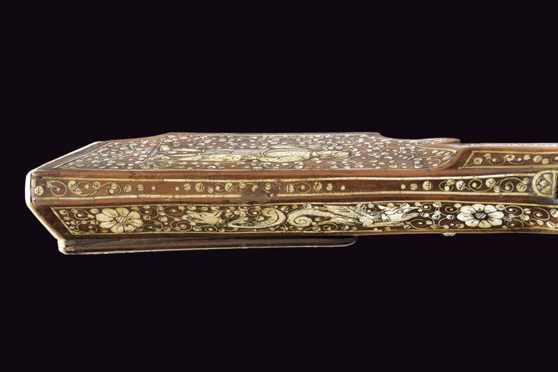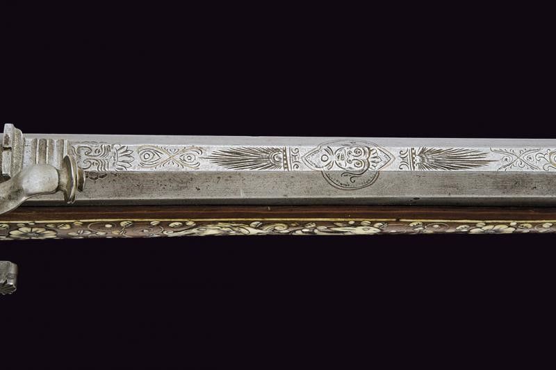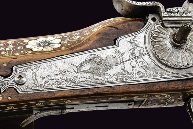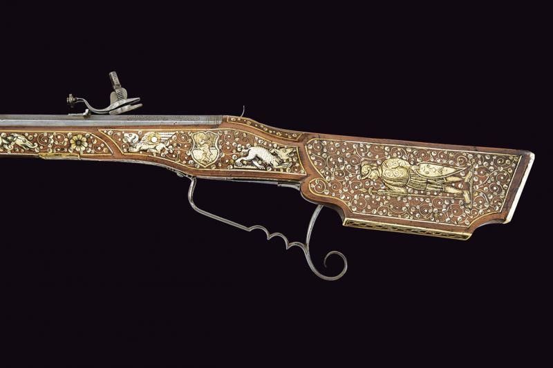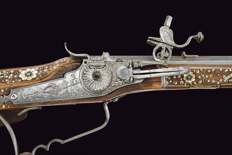 fine del XVII Sec. Canna ottagonale rigata, incisa oltre alla metà con mascheroni e motivi floreali parzialmente rimessi in rame; alzo in ferro e mirino in ottone, cal. 15 mm. Codetta incisa. Batteria semi-interna incisa ed intagliata con scena di caccia e motivi floreali; parte del meccanismo interno mancante e non funzionante. Bella cassa in legno di frutto riccamente decorato con tarsie in osso raffiguranti animali grotteschi, sulla guancia sinistra una figura con alabarda e scudo, scudetto di una famiglia, motivi floreali e con cornici (la lastra del calciolo di restauro). Patchbox da fissare. Ponticello anatomico in ferro. Stecher mancante. Difetti e piccole sostituzioni. Bacchetta non pertinente. Questo lotto è importato da un Paese extra UE e comporta una tassazione aggiuntiva rispetto alla commissione della casa d'aste e alla tassa sul servizio. Di conseguenza, la commissione totale, comprensiva di tutte le tasse, ammonta al 35%.