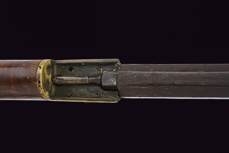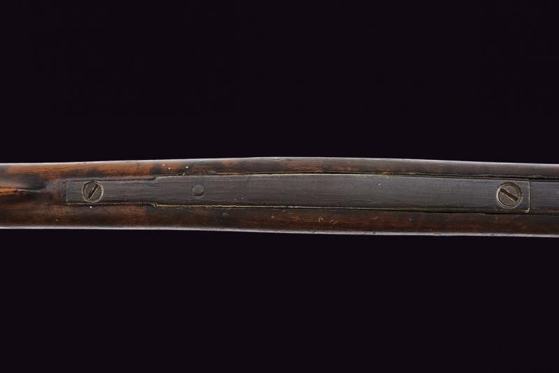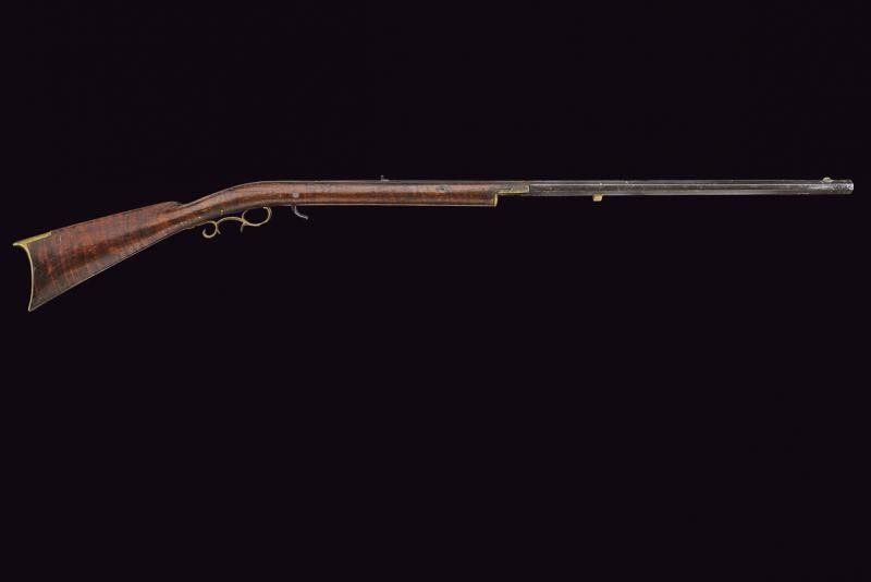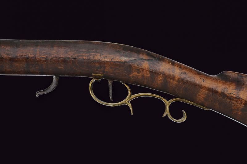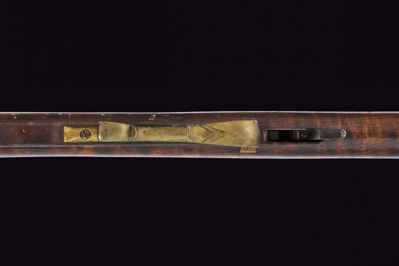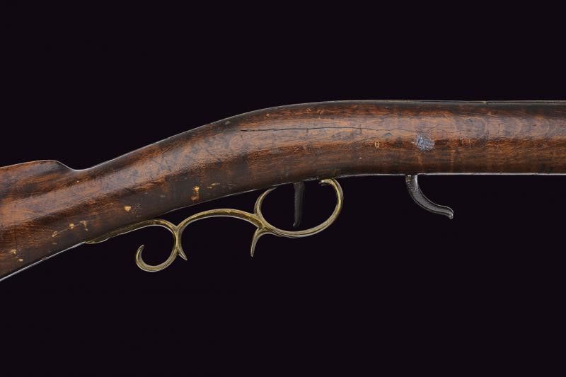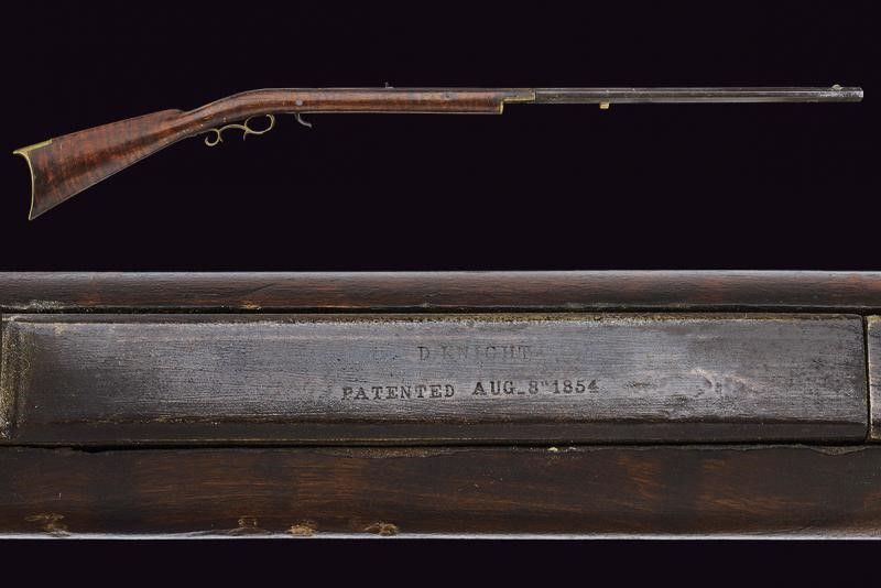 USA, lunghezza 139 cm. 1860 circa Canna ottagonale con mirino, cal. 8 mm. Dietro alla canna nella parte inferiore il pistone. Cassa in legno (piccoli difetti) con lunga bindella marcata 'D. KNIGHT PATENTED 8TH AUG 1854' e munita di alzo. Davanti al ponticello in ottone si trova un gancio per caricare il lungo percussore. La forma del calcio in stile Kentucky. Calciolo in ottone. Raro. Questo lotto è importato da un Paese extra UE e comporta una tassazione aggiuntiva rispetto alla commissione della casa d'aste e alla tassa sul servizio. Di conseguenza, la commissione totale, comprensiva di tutte le tasse, ammonta al 35%.