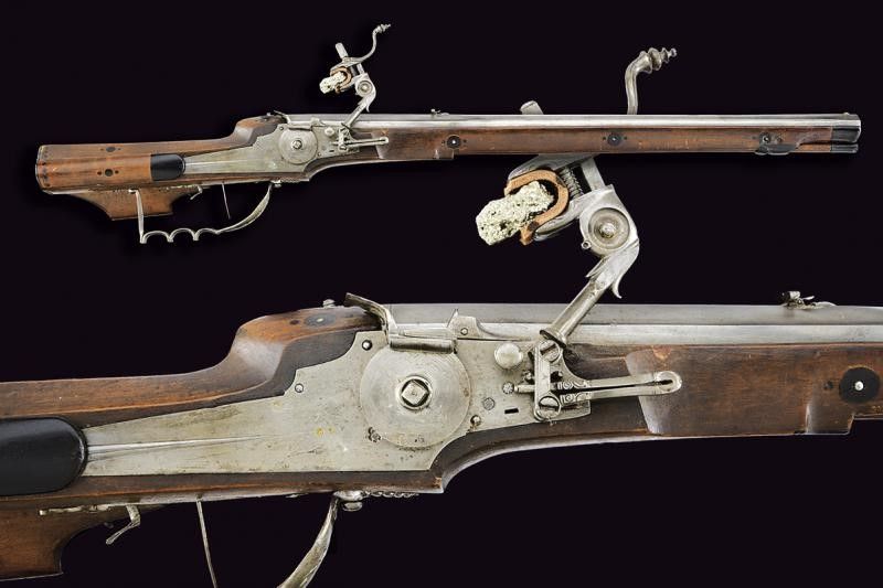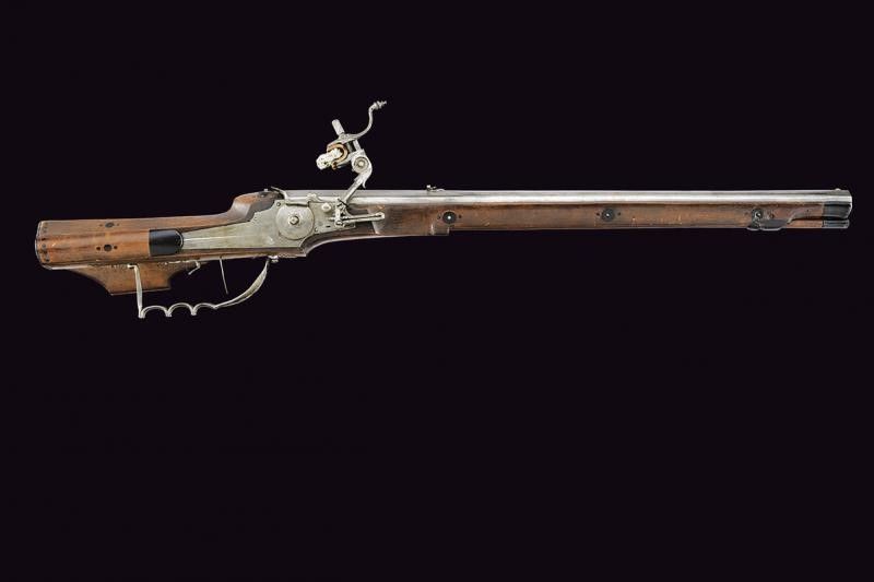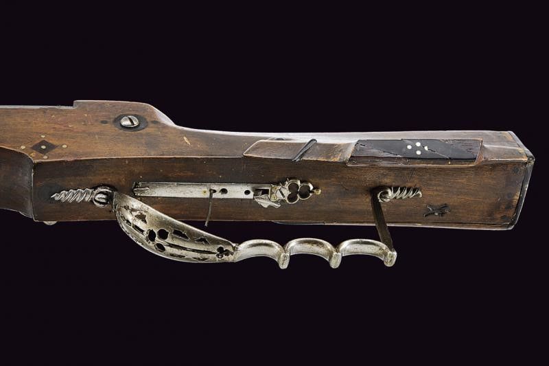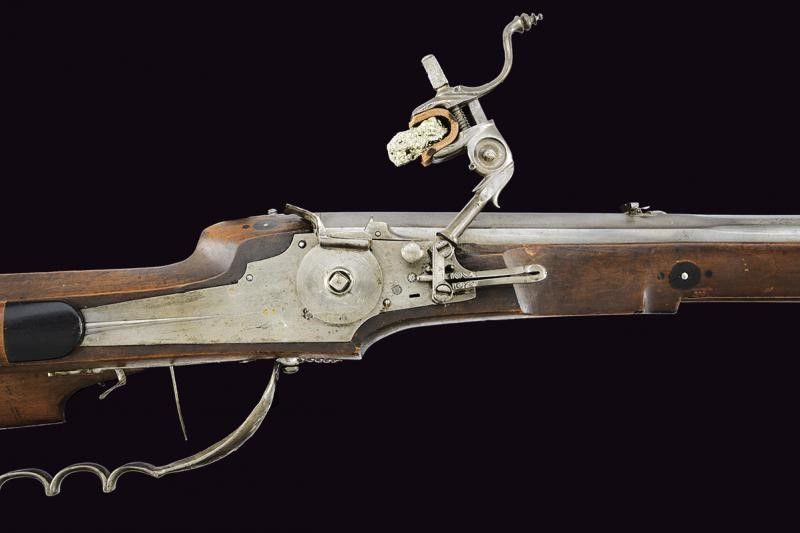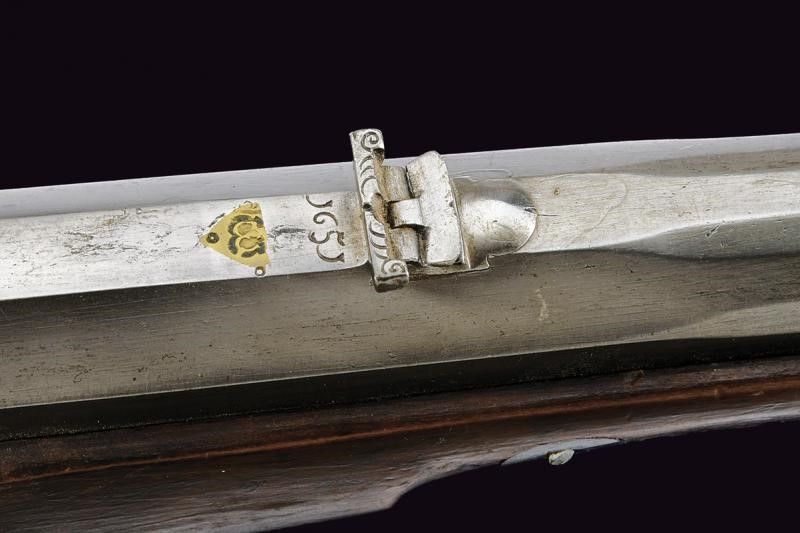 1651 Pesante canna rigata a tre ordini, la prima parte ottagonale con lunga scanalatura che parte dalla codetta, dopo una marca dell'armaiolo rimessa in ottone e la data '1651', alzo variabile leggermente inciso, in seguito a sedici facce ed infine alla volata nuovamente ottagonale, mirino in ottone, cal. 16 mm. Batteria a ruota esterna con cartella piatta decorata con una duplice scanalatura che parte da un punto in comune e si allarga, vicino alla ruota la stessa marca dell'armaiolo; cane e molla intagliati, scodellino con copriscodellino scorrevole e parascintille. Cassa intera in legno decorato con placche in corno nero; patch-box fisso (da liberare); sotto il calcio un punzone a fuoco a forma di due pesci speculari e con numero di inventario '5'. Ponticello anatomico e traforato a motivi geometrici. Grilletto con stecher funzionate. Bacchetta in legno. Questo lotto è importato da un Paese extra UE e comporta una tassazione aggiuntiva rispetto alla commissione della casa d'aste e alla tassa sul servizio. Di conseguenza, la commissione totale, comprensiva di tutte le tasse, ammonta al 35%.