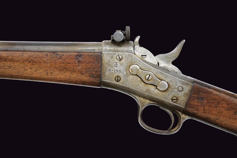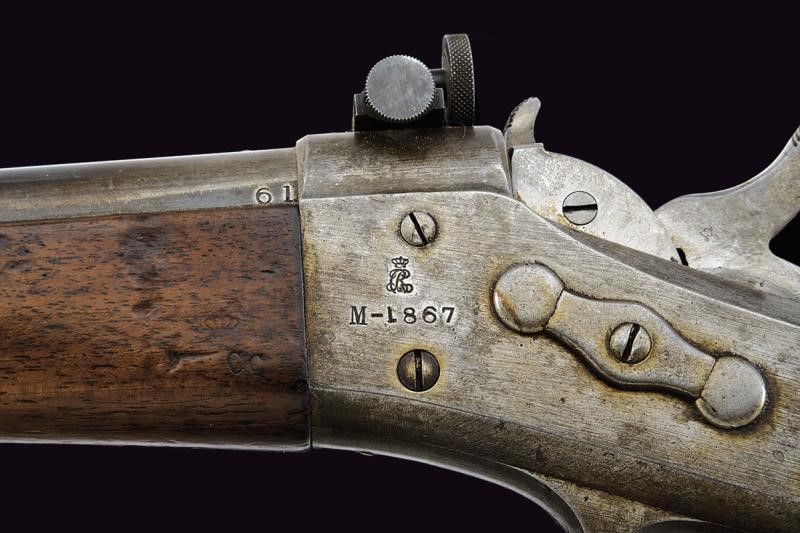 1882 Canna tonda, rigata (anima pulita, rigatura ben visibile), nella prima parte si trovano dei fori parzialmente riempiti di vecchi mirini; mirino professionale da gara, cal. 11 mm. Castello marcato 'M-1867' e con punzone, la codetta 'KJOBENHAVNS TOIHUUS 1882'; davanti al tipico otturatore con estrattore automatico, si trova una diottra di precisione. Calcio ed astina in legno. Fornimenti in ferro. Bacchetta mancante. Meccanica funzionate. Questo lotto è importato da un Paese extra UE e comporta una tassazione aggiuntiva rispetto alla commissione della casa d'aste e alla tassa sul servizio. Di conseguenza, la commissione totale, comprensiva di tutte le tasse, ammonta al 35%.