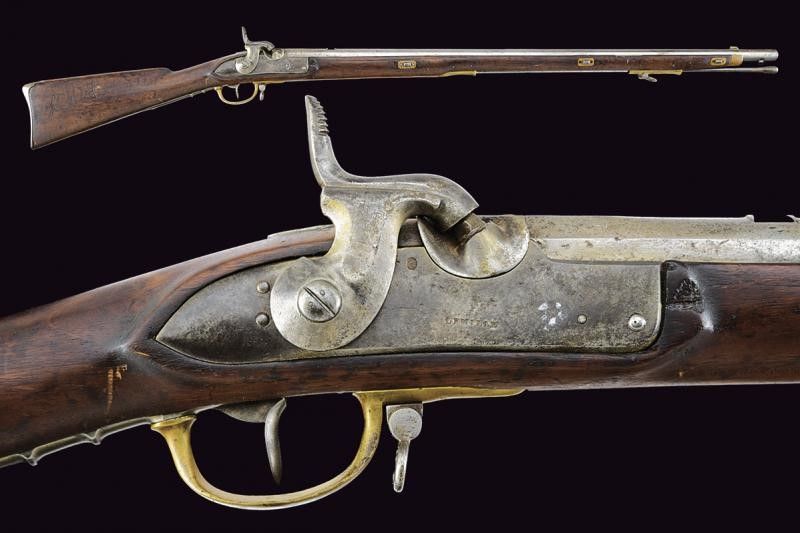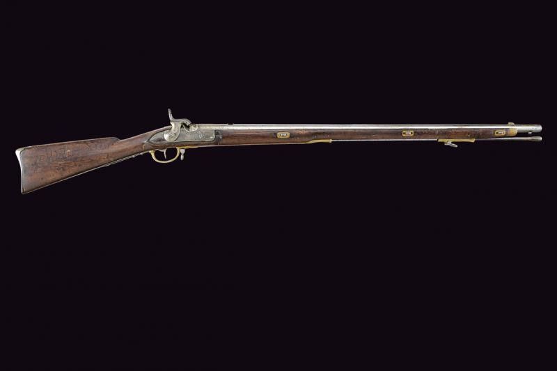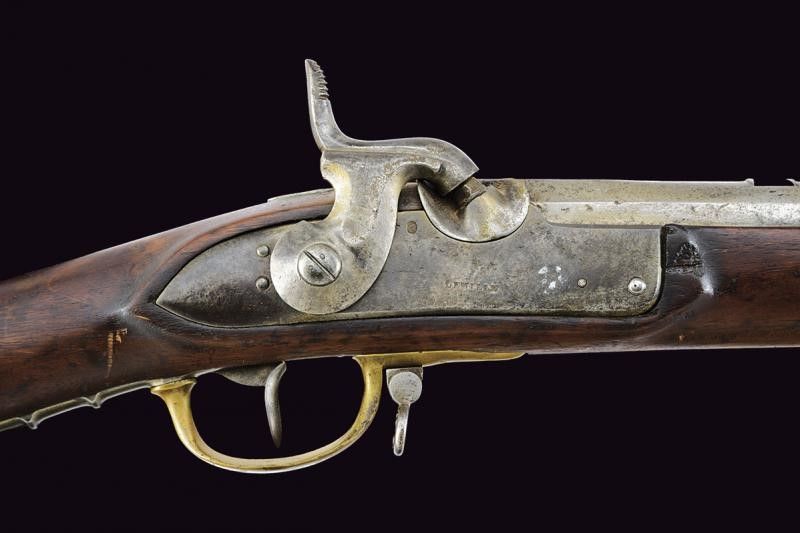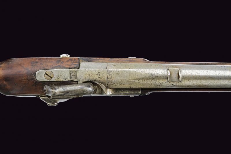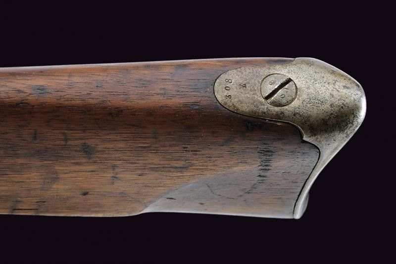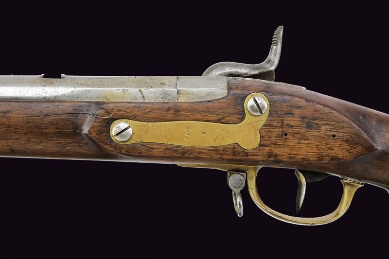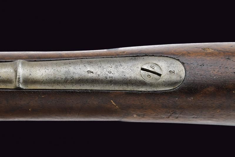 Canna rigata (anima pulita, rigatura appena visibile), tonda con base ottagonale marcata '308', punzone del banco di prova di Liegi e un'altro punzone; alzo mancante, mirino in ottone, attacco per la baionetta, cal. 17 mm. Batteria a molla in avanti firmata 'LEMILLE' e con punzone. Cassa intera in legno (piccole mancanze e una crepa). Calcio marcato 'S.M.H.' e con altre marcature. Fornimenti in ottone e ferro, tutti marcati con la stessa matricola e con punzoni. Bacchetta in ferro. Questo lotto è importato da un Paese extra UE e comporta una tassazione aggiuntiva rispetto alla commissione della casa d'aste e alla tassa sul servizio. Di conseguenza, la commissione totale, comprensiva di tutte le tasse, ammonta al 35%.
