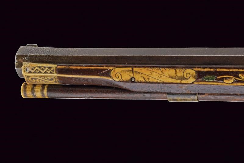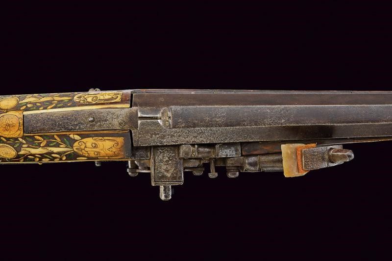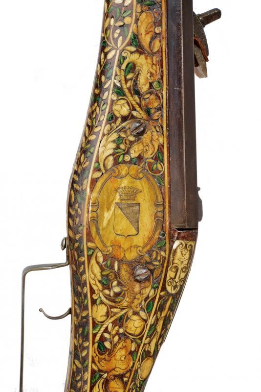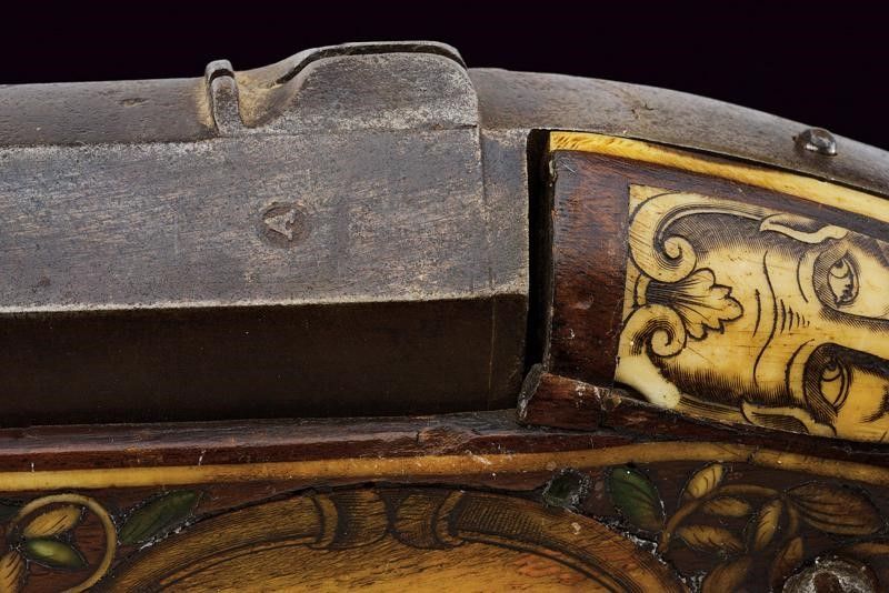 Fine del XVI Secolo Pesante, lunga canna liscia di forma ottagonale, la base con alzo e punzone 'A' entro un cerchio; mirino, cal. 17 mm. Lunga codetta piatta e leggermente angolata. Grande batteria a ruota esterna, la copertura della ruota traforata ed incisa, cartella piatta marcata con un punzone 'ID / B' e con incisioni floreali; la molla e il cane leggermente intagliati, copriscodellino a scatto (manca una delle due viti). Cassa intera in legno di frutto riccamente decorato con placche e tarsie in osso inciso e parzialmente dipinto di verde, le parti laterali della codetta con due volti maschili, su entrambe le parti del calcio un volatile e un drago fra motivi floreali, vicino alla contropiastra grande stemma nobiliare da conte tra teste di drago e motivi floreali; poche placche di restauro, piccole mancanze. Ponticello e calciolo in ferro. Bacchetta in legno con battipalla in osso. Questo lotto è importato da un Paese extra UE e comporta una tassazione aggiuntiva rispetto alla commissione della casa d'aste e alla tassa sul servizio. Di conseguenza, la commissione totale, comprensiva di tutte le tasse, ammonta al 35%.