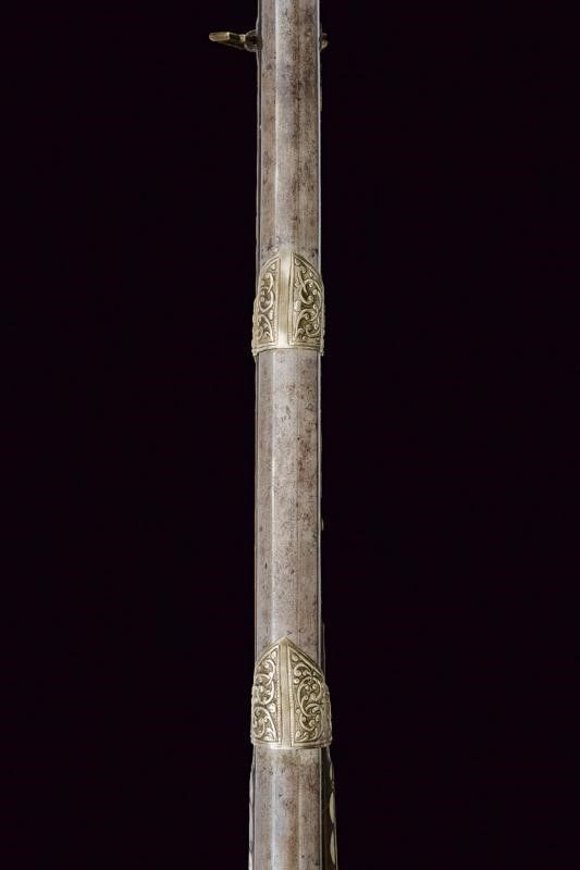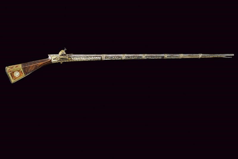 Fine XVIII inizio XIX Secolo Lunghissima canna ottagonale, liscia, l'alzo alla base e la prima parte ricoperte di lamina d'argento incisa a motivi floreali, mirino in argento, cal. 15 mm. Anche la codetta rivestita e incisa en suite. Batteria alla micheletta con cane di tipica forma a dorso tondeggiante, ricoperta in lamina d'argento sobriamente inciso a racemi. Cassa intera in legno con calcio a sezione pentagonale e sottile; la parte centrale decorata con innumerevoli placche in madreperla, tarsie circolari in ottone e con sottili filamenti intrecciati in argento (varie mancanze); l'ultima parte del calcio riccamente decorata con tarsie in ottone, placche in madreperla e liste in osso dipinto in color verde. Le fascette reggicanna in argento sbalzato a motivi floreali. Il lungo reggi-bacchetta in lamina d'argento decorato en suite. Bacchetta in ferro. Piccoli difetti e mancanze generali. Molto raro. Questo lotto è importato da un Paese extra UE e comporta una tassazione aggiuntiva rispetto alla commissione della casa d'aste e alla tassa sul servizio. Di conseguenza, la commissione totale, comprensiva di tutte le tasse, ammonta al 35%.