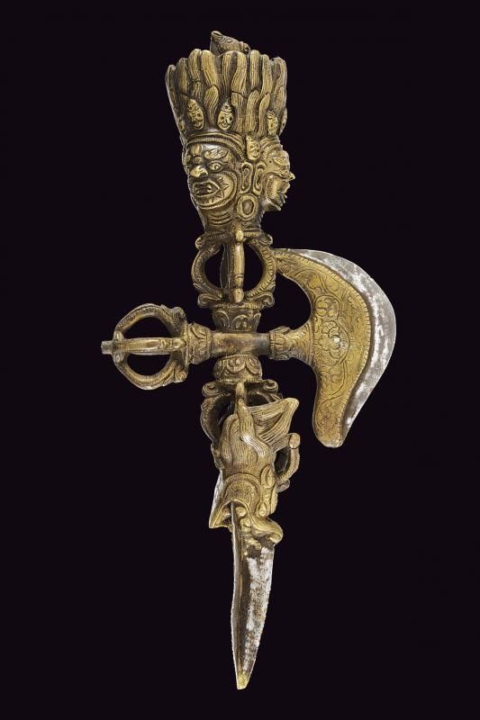 Tibet, lunghezza 29 cm. XIX Secolo Bella esecuzione in bronzo in bronzo inciso, la lama della kartika e il puntale in ferro. Questo lotto è importato da un Paese extra UE e comporta una tassazione aggiuntiva rispetto alla commissione della casa d'aste e alla tassa sul servizio. Di conseguenza, la commissione totale, comprensiva di tutte le tasse, ammonta al 35%.